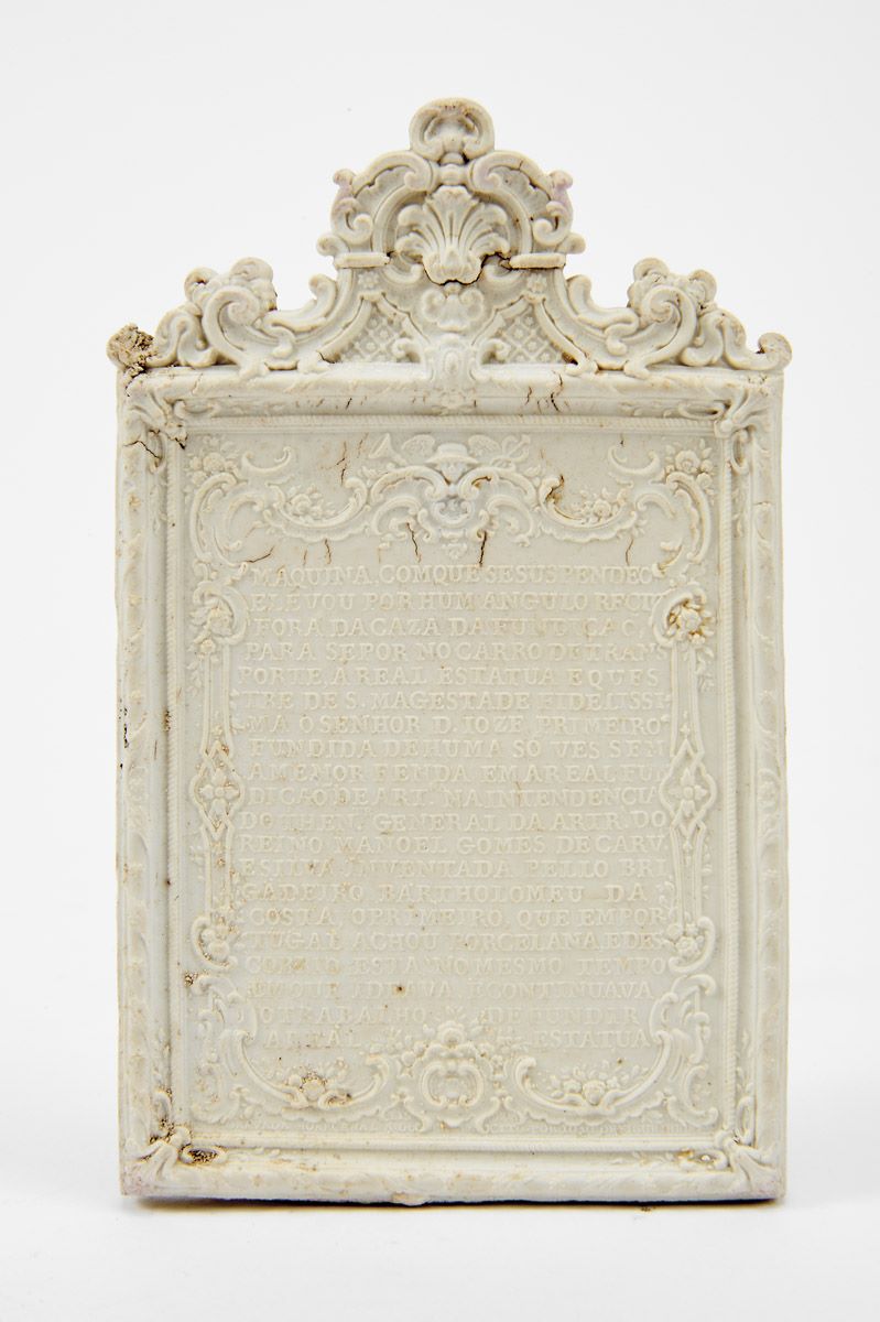 - medalha em biscuit relevado reproduzindo a maquinaria de suspensão da "Estátua Equestre do Rei D. José I", estátua, reservas e verso com inscrições relativas ao tema, inscrição LISBOA - GRAVADA NO ARCENAL R. DO EXERCITO POR IOAO DE FIGUEIREDO