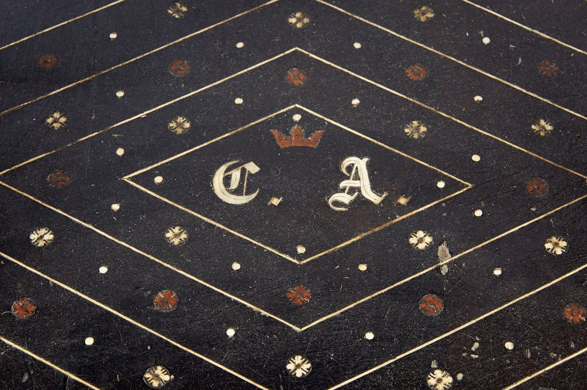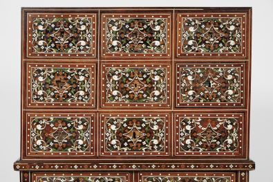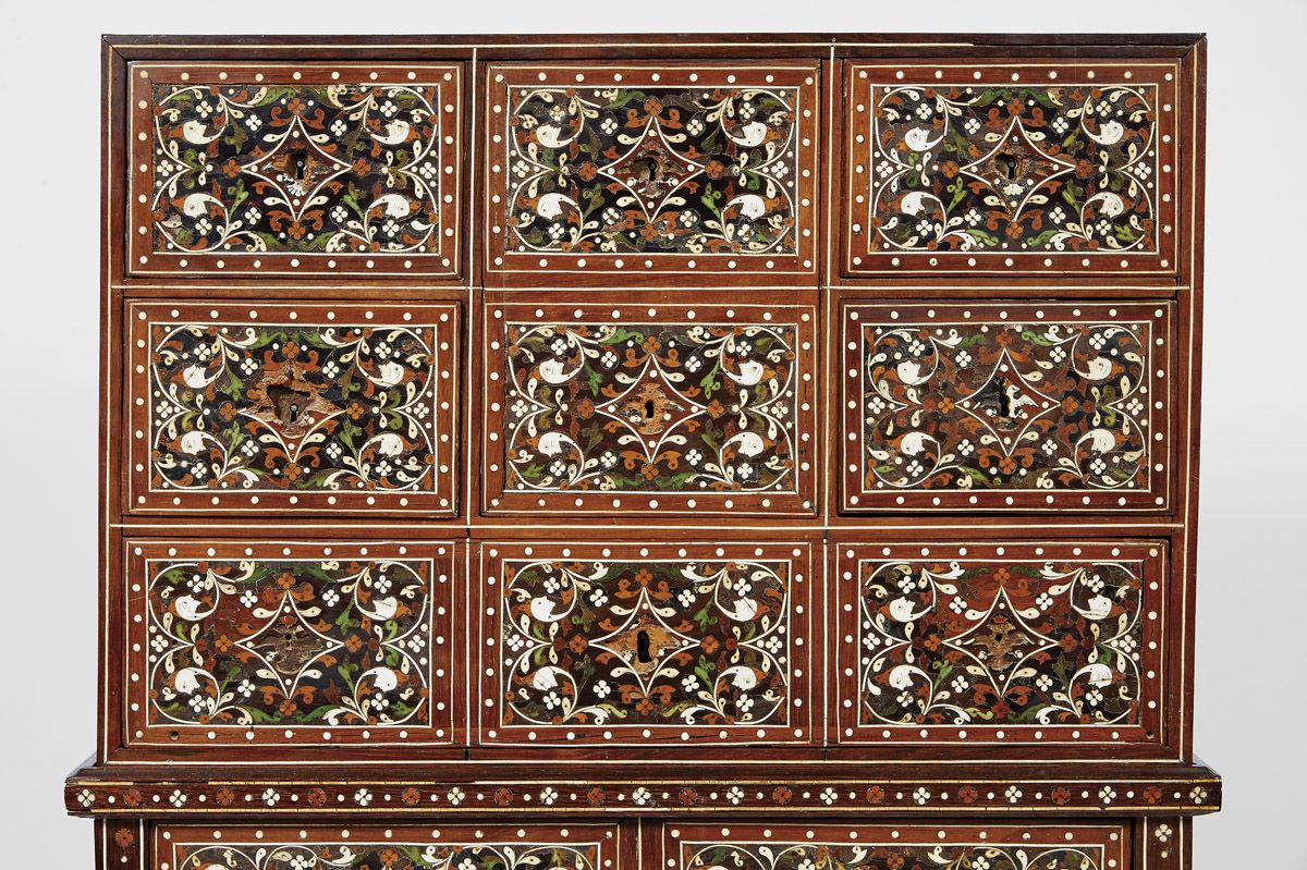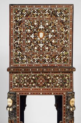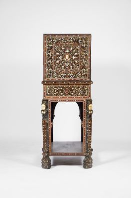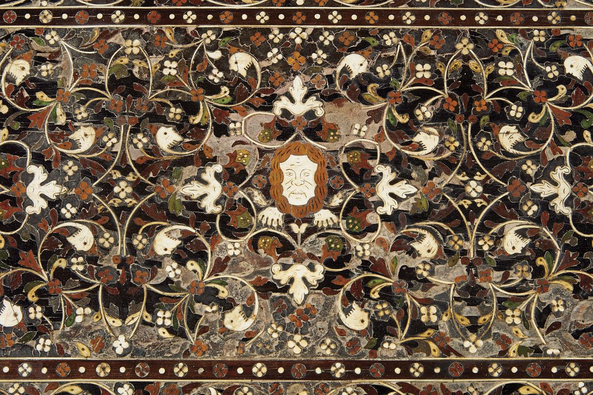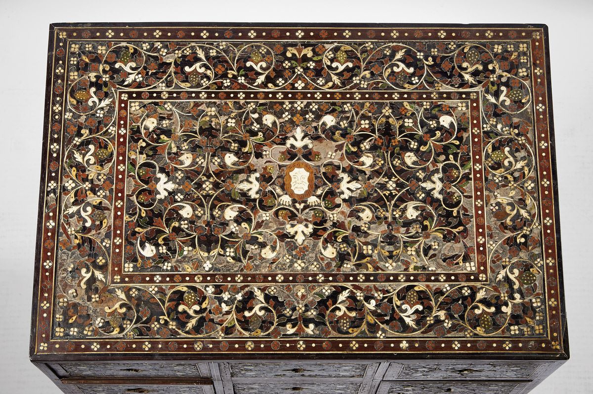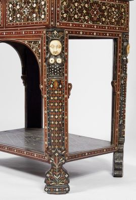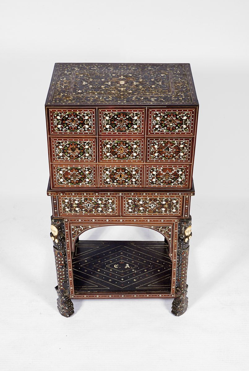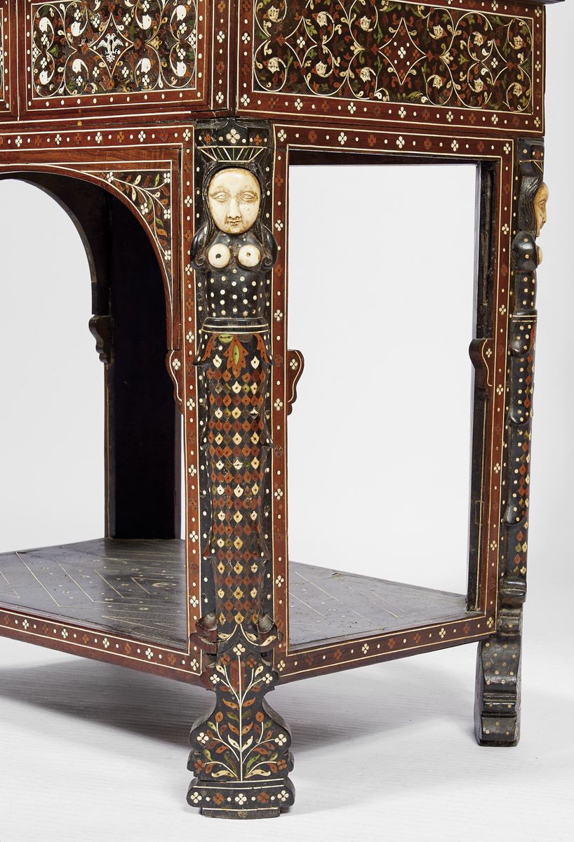 - marchetaria de ébano, sissó, teca, outras madeiras, marfim e marfim tingido com pinos de cobre dourado "Fauces de leão, cabeças fantásticas, águias bicéfalas e motivos vegetalistas", trempe de decoração semelhante com pernas esculpidas "Nagas" com cabeças e peitos de marfim