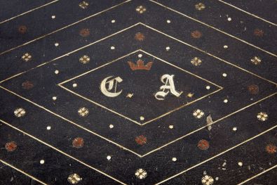 - muitas faltas nos embutidos, diversos frisos e embutidos refeitos, falta das ferragens, fechaduras modernas, alguns interiores das gavetas refeitos, diversos pedaços soltos, trempe revivalista com elementos de época integrados e monograma coroado CA