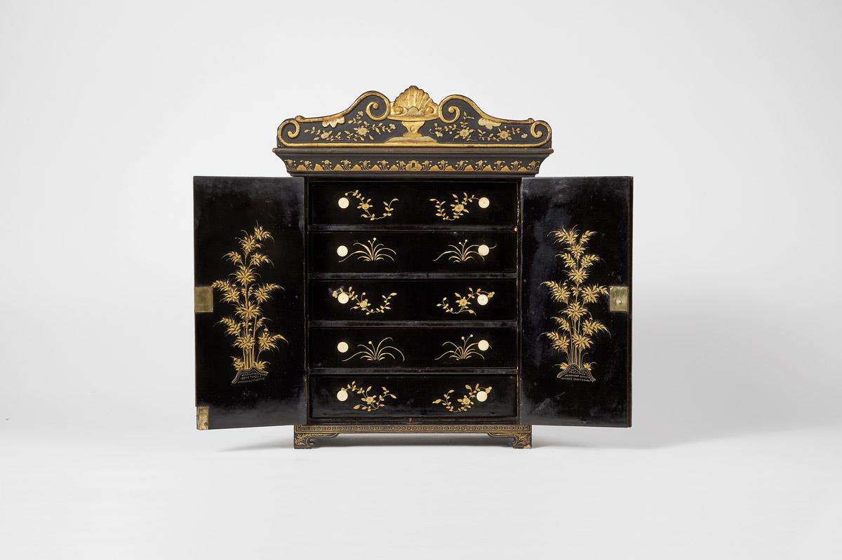- decoração a dourado "Flores" com reservas "Paisagens orientais com figuras", cimalha entalhada, interior com gavetas