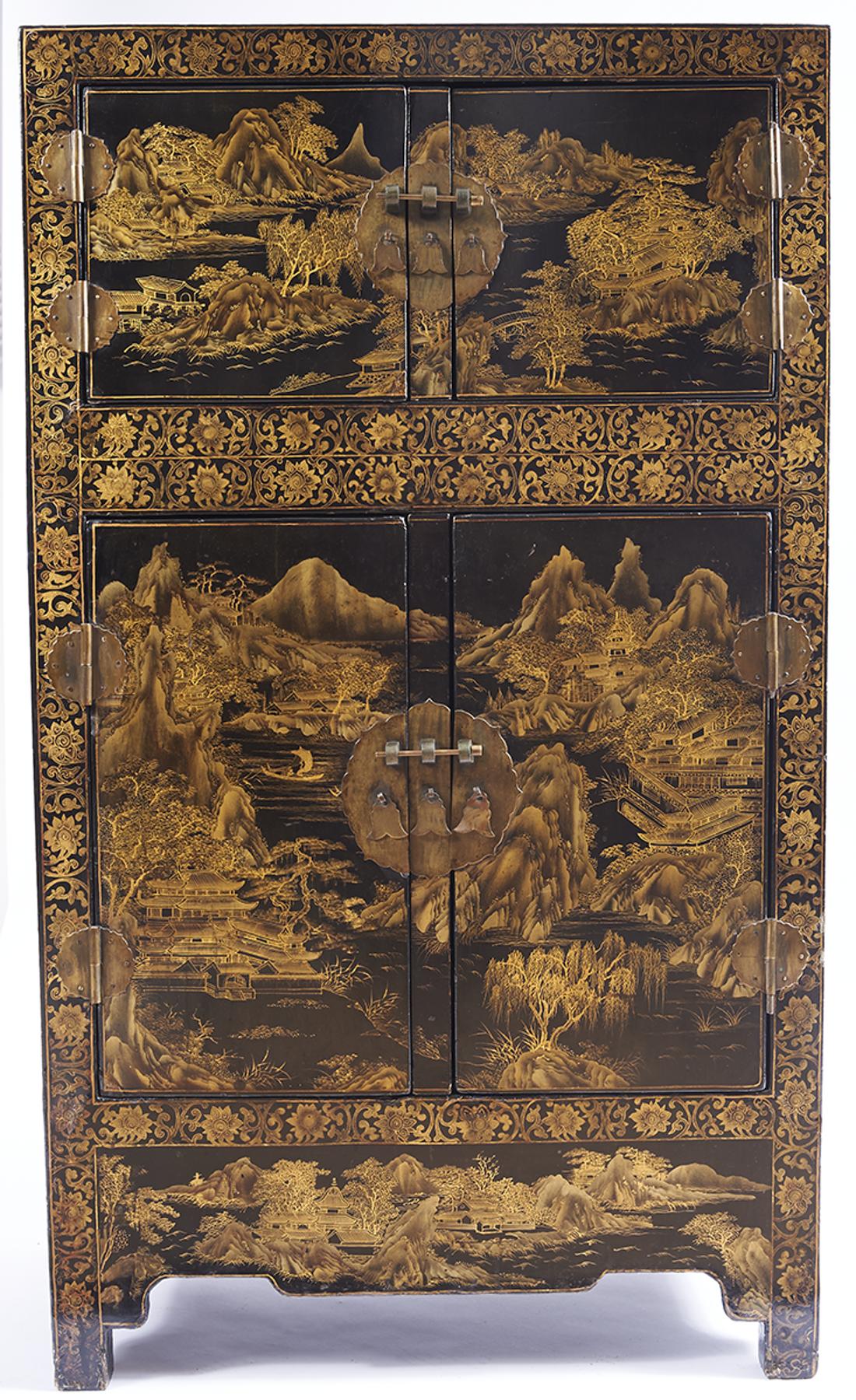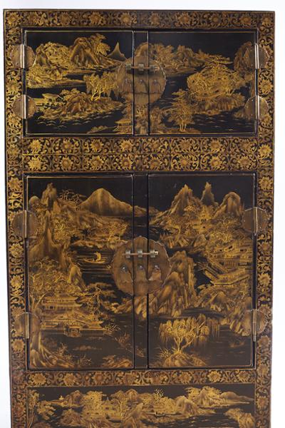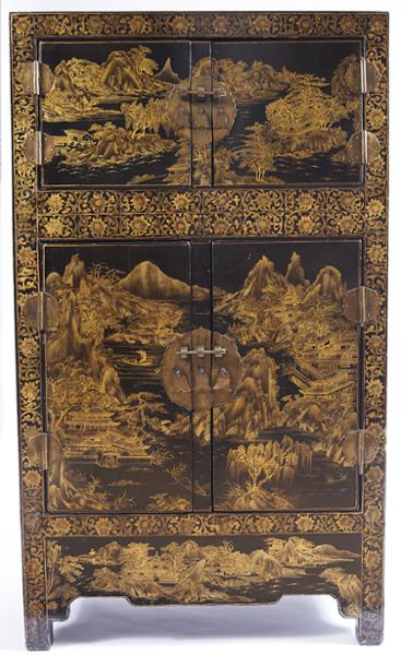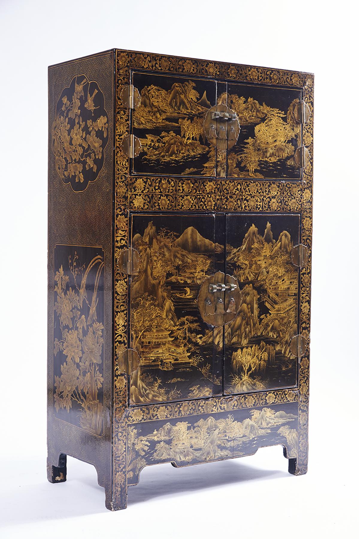 - decoração a dourado "Paisagens orientais" e "Pássaros e flores", ferragens em metal recortado
