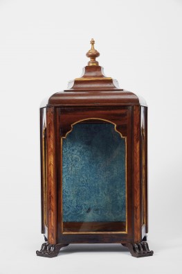 - marchetaria de pau-santo e pau-rosa, frisos e pináculo dourados, interior pintado