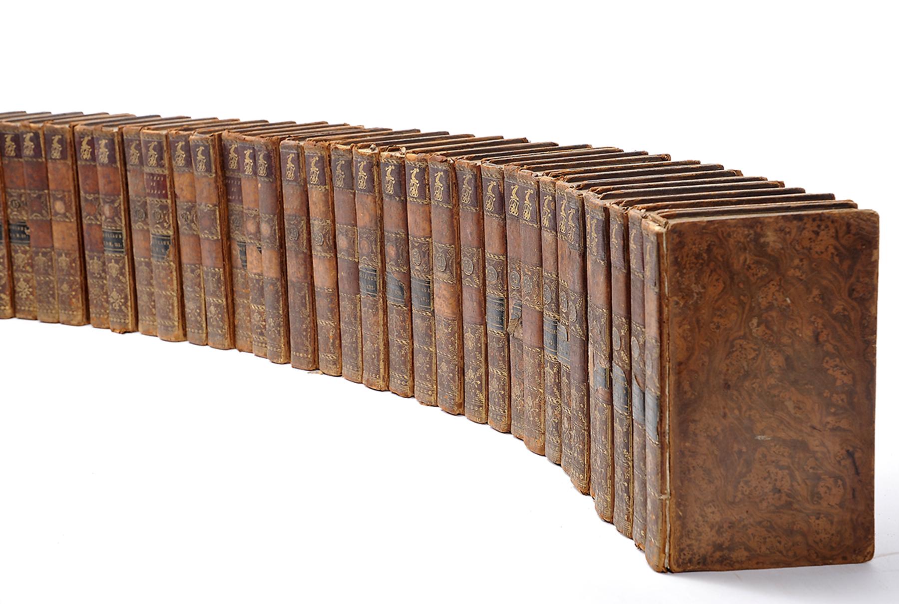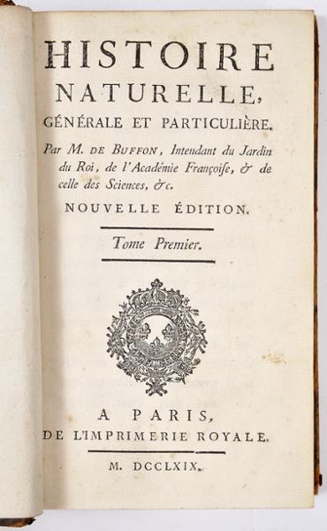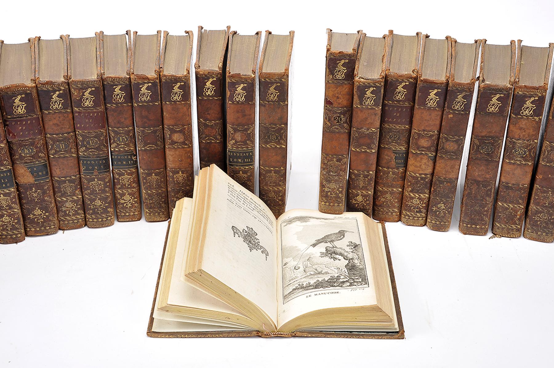 - BUFFON, Comte de.- Histoire naturelle générale et particulière.- Nouvelle édition.- A Paris: de l'Imprimerie Royale, 1769-1783.- 43 vols.: il.; 17 cm.- E. Obra clássica que, embora do ponto de vista científico não tenha a importância correspondente à sua fama, é sobretudo apreciada pelas atraentes gravuras que geralmente a ilustram. Conjunto constituído pelos seguintes volumes. Tomos I a IX: Théorie de la Terre & Introduction à l’Histoire des Minéraux (17 gravuras e 2 mapas desdobr.); tomos X e XI: Suite à l’Histoire Naturelle de l’Homme (6 gravuras); tomos XII e XIII: Les Époques de la Nature (6 gravuras e 2 mapas desdobr.); [tomo XIV]: Tables de matières... (não ilustrado); tomos XV a XXX: Histoire Naturelle des Oiseaux (231 gravuras); tomos XXXI a XLI: Histoire des Animaux Quadrupèdes (306 gravuras); tomos XLII e XLIII: Histoire Naturelle des Minéraux (não ilustrado). Na numeração dos tomos seguimos a numeração dos rótulos das encadernações. No entanto, cremos que o tomo XIV (Table des matières), com um rótulo errado (oiseaux) deverá corresponder a um índice final. O total de gravuras deverá ser de 567, mais 6mapas desdobráveis. Uma vez que a obra não apresenta qualquer índice de gravuras e tornando-se difícil a colação, o conjunto é vendido de acordo com as condições descritas. Encadernações da época, inteiras de carneira racinée, cansadas, com falta de alguns rótulos, apresentando à cabeça das lombadas o monograma RJ. Todos os volumes apresentam dois ex-libris heráldicos ingleses: Gen. Hon. Robert Taylor e Marquess of Headford.