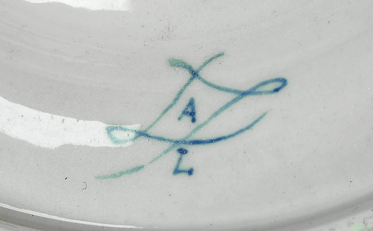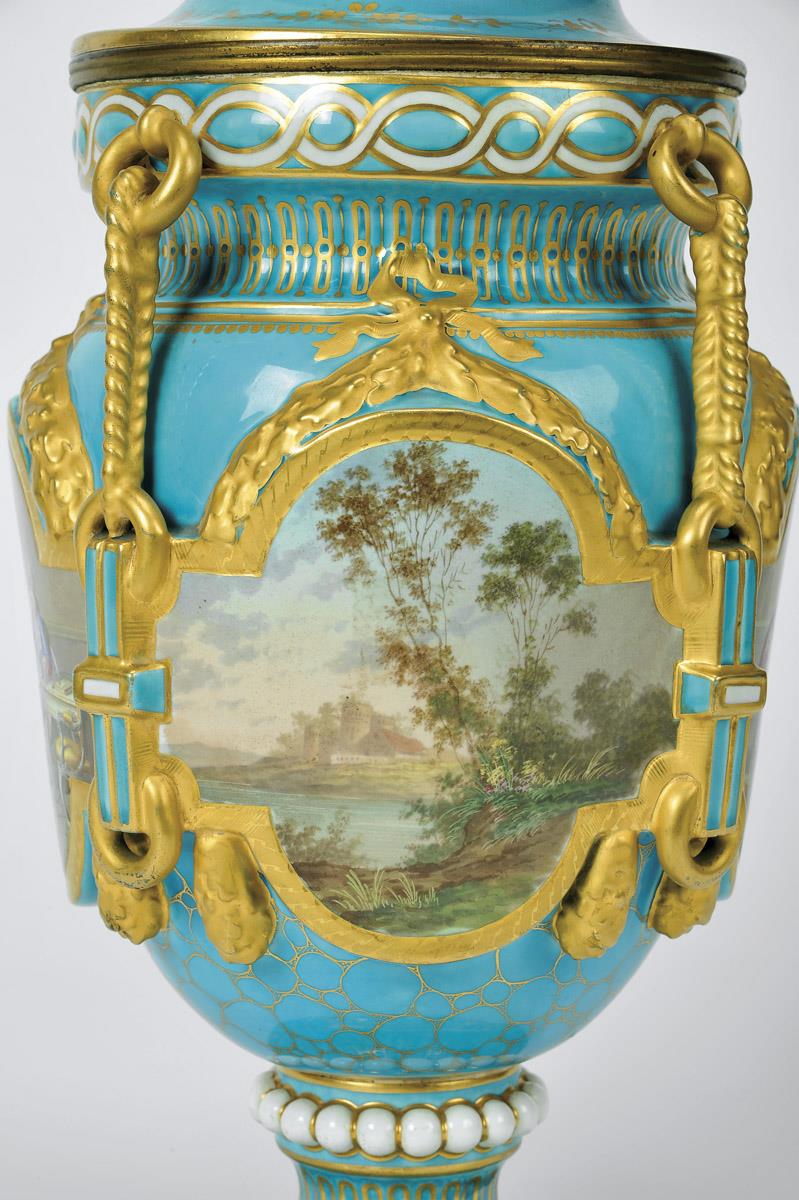 - decoração policromada e dourada sobre fundo azul "Luís XVI" e "Maria Antonieta"