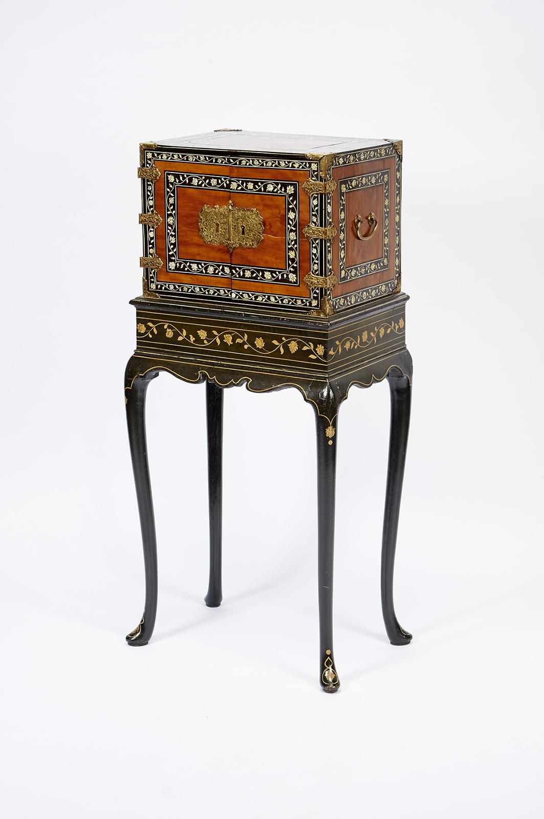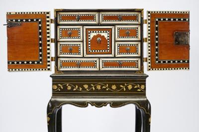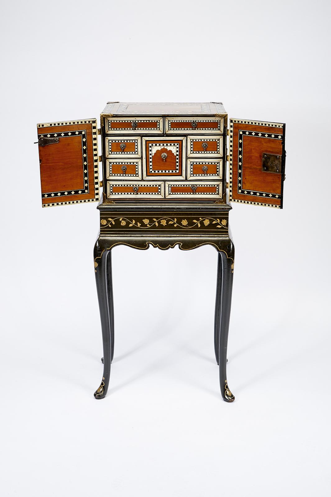 - interior com nove gavetas tendo a central um arco de feição islâmica, ferragens em cobre recortado,