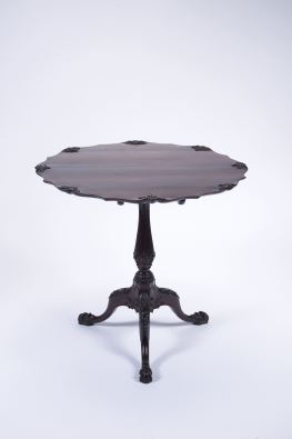 - tampo redondo recortado basculante com entalhamentos, coluna central canelada e entalhada com pés entalhados