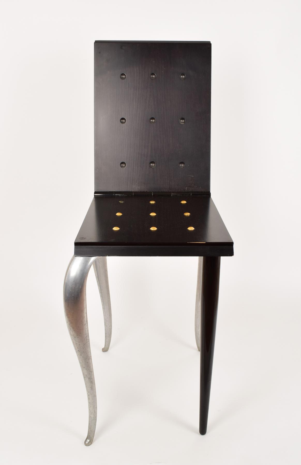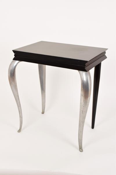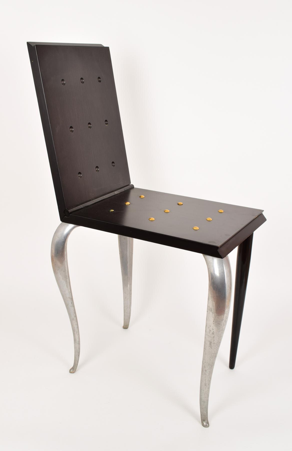 - madeira ebanizada, pés em alumínio e pregos dourados