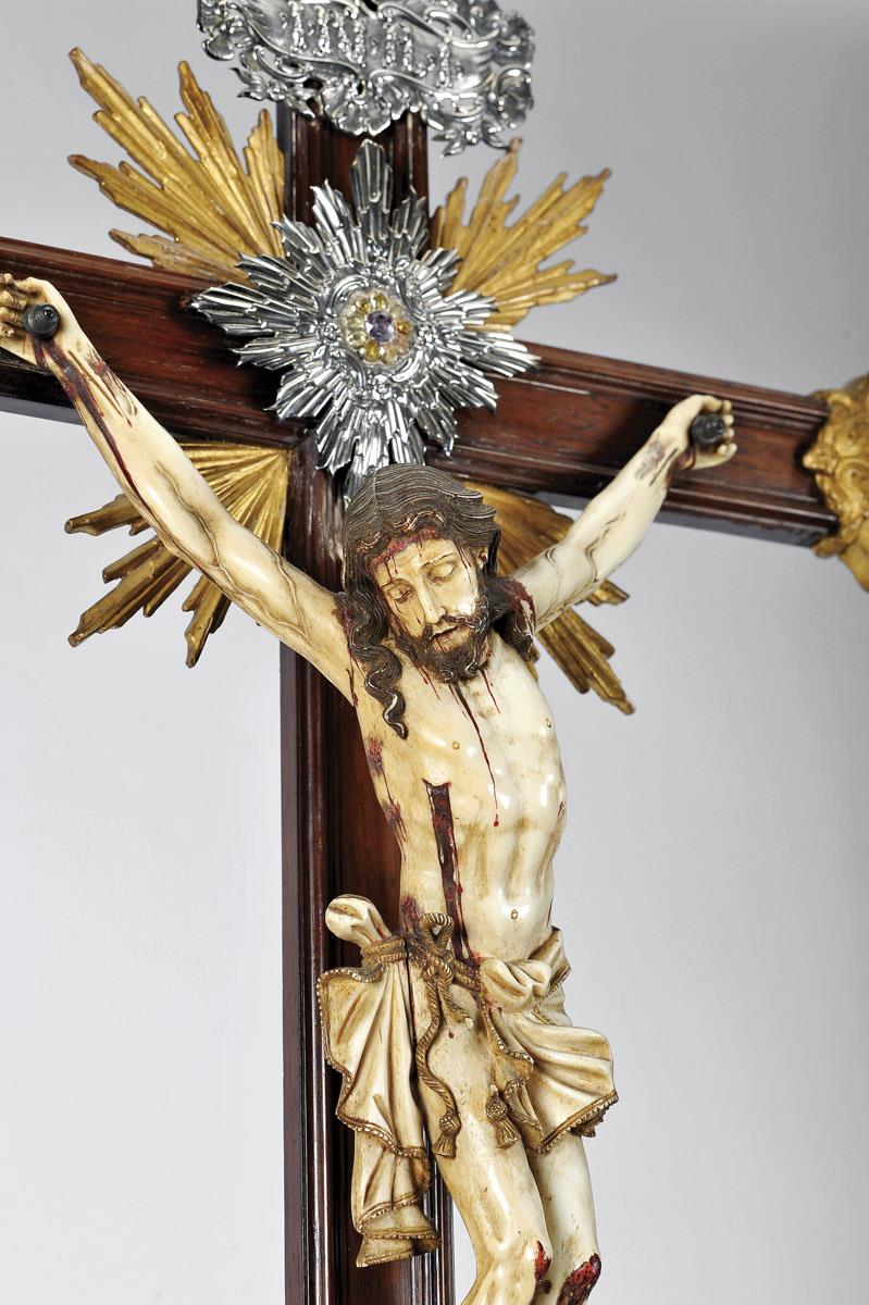 - cruz e peanha em pau-santo com entalhamentos dourados, resplendor em prata cravejado com 9 topázios e ametista e aplicação em prata INRI