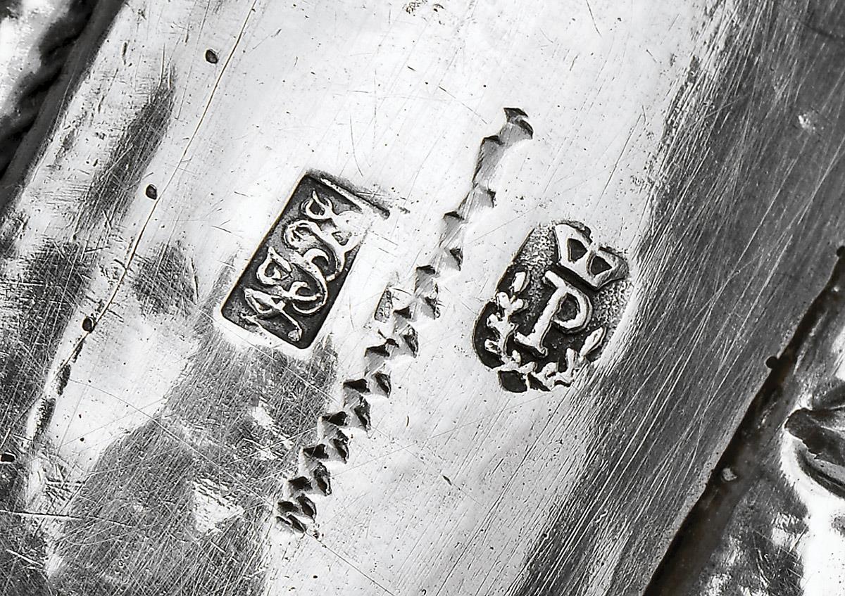 - decoração relevada "Roseiras", marca de ensaiador do Porto (1843-1853), marca de ourives de AJRJ (1843-1853)◙Porto (1843-1853)