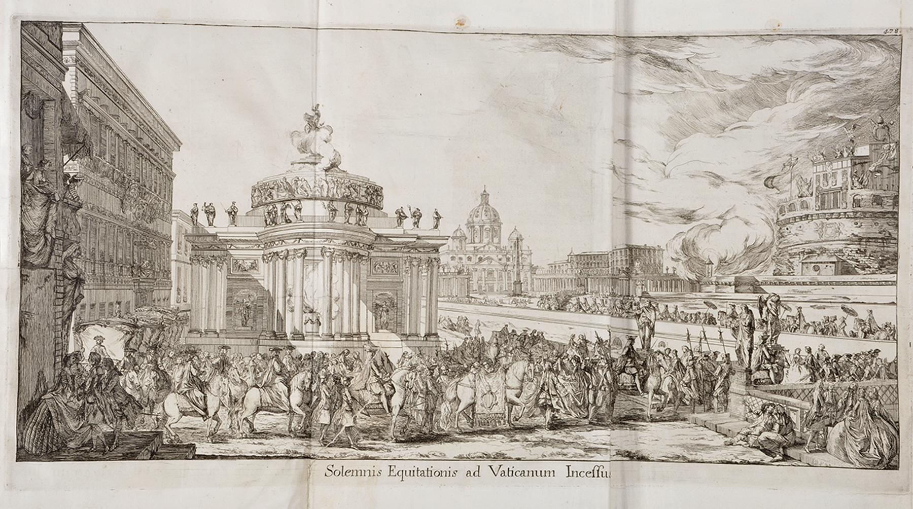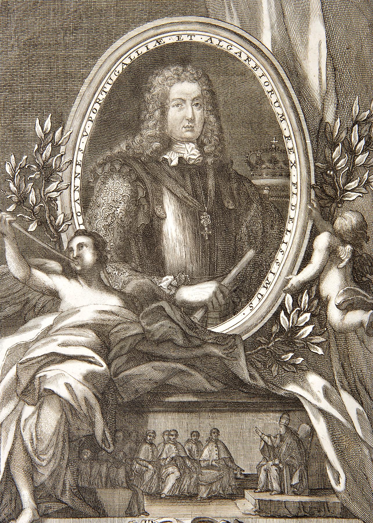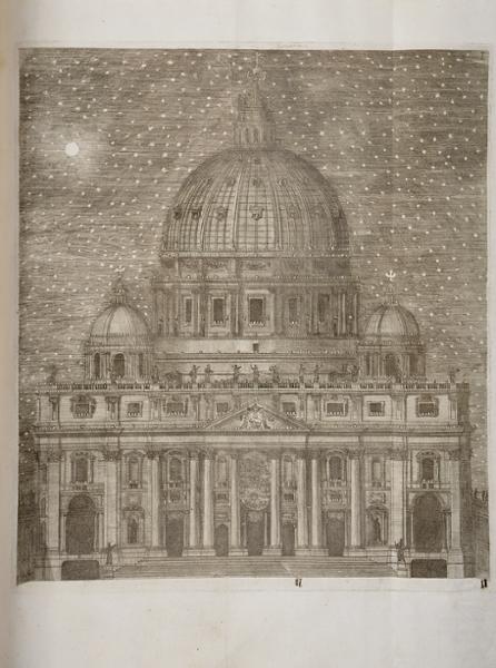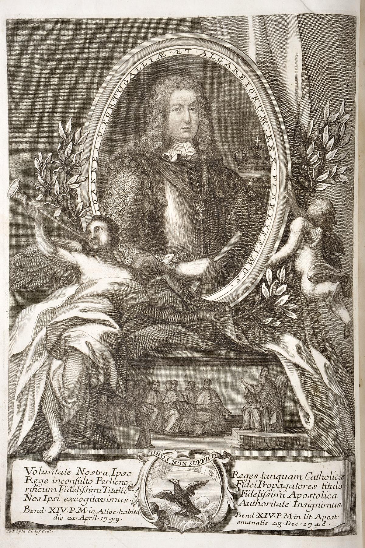 - Una cum Apostolis Literis Sanctissimi Domini Nostri Benedicti XIV. et Vaticanæ Basilicæ ornatus descriptione.- Romæ: Execudebant Nicolaus, et Marcus Palearini, 1749.- XXVIII, 634, [1, 1 br.] p.: il.; 34 cm.- E. Obra monumental com importante aparato gráfico: retrato de D. João V, inscrito em oval, junto ao rosto (subscrição: Io, Bapta. Sintes Scul.(Giovanni Baptista Sintes - Ernesto Soares, História, p. 588, que não refere o retrato); 4 gravuras (plantas), junto às páginas 24, 52, 151 e 462; 1 grav. desdobr. (Solemnis equitationis ad Vaticanum incessus), p. 478; 1 grav. desdobr. (Exhibitio census in Aula Regia Vaticani), p. 478; 1 grav. desdobr. (planta e corte), p. 481. No final, com separador tipográfico, a documentação iconográfica do exterior e interior da Basílica de S. Pedro, com 32 gravuras (aliás 31), numeradas de I a XXXII, com falta da gravura XII. Encadernação recente, inteira de carneira, com falta do anterrosto.