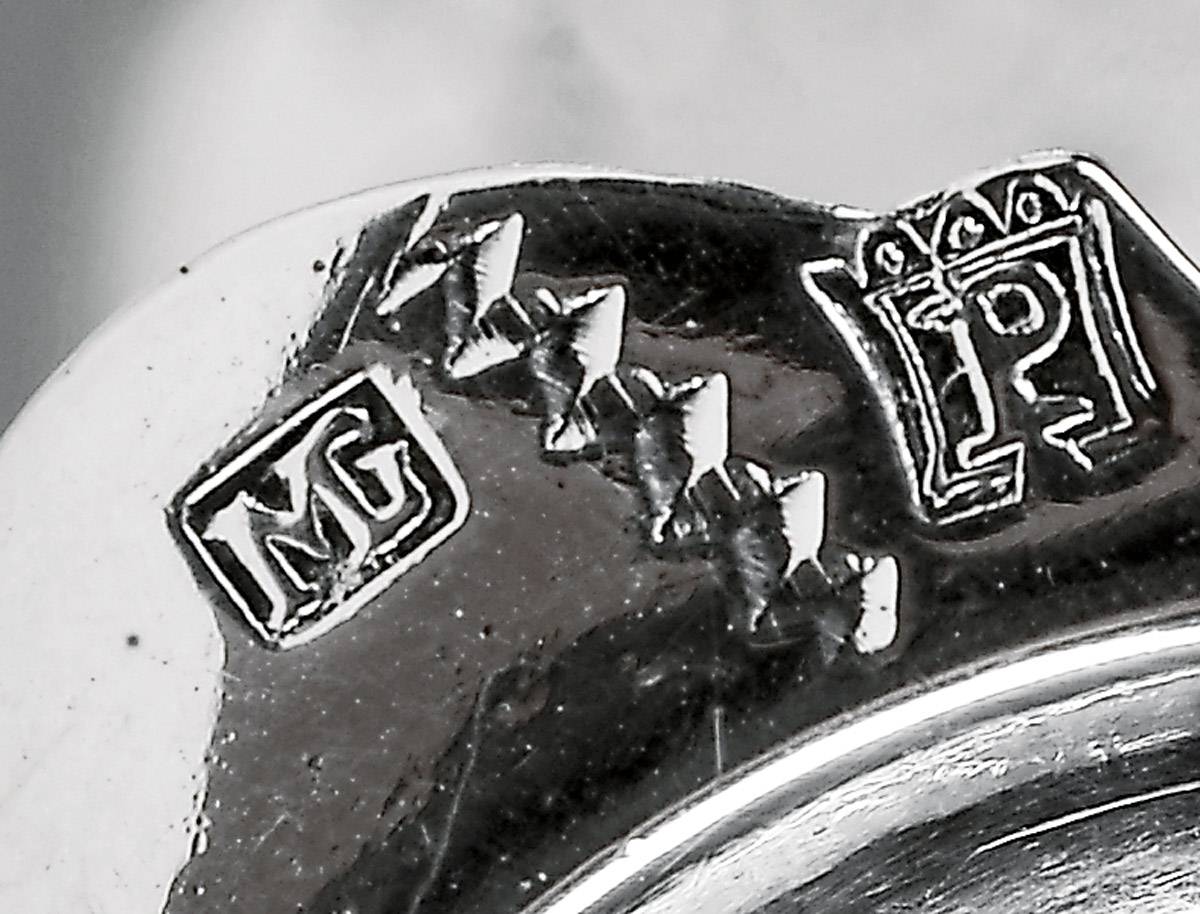 - segundo modelo de John Cafe (1740-1800), decoração relevada no cantos "Concheados", marca de ensaiador do Porto (1803-1810), marca de ourives Manuel Vilaça Gomes (1763-1804)