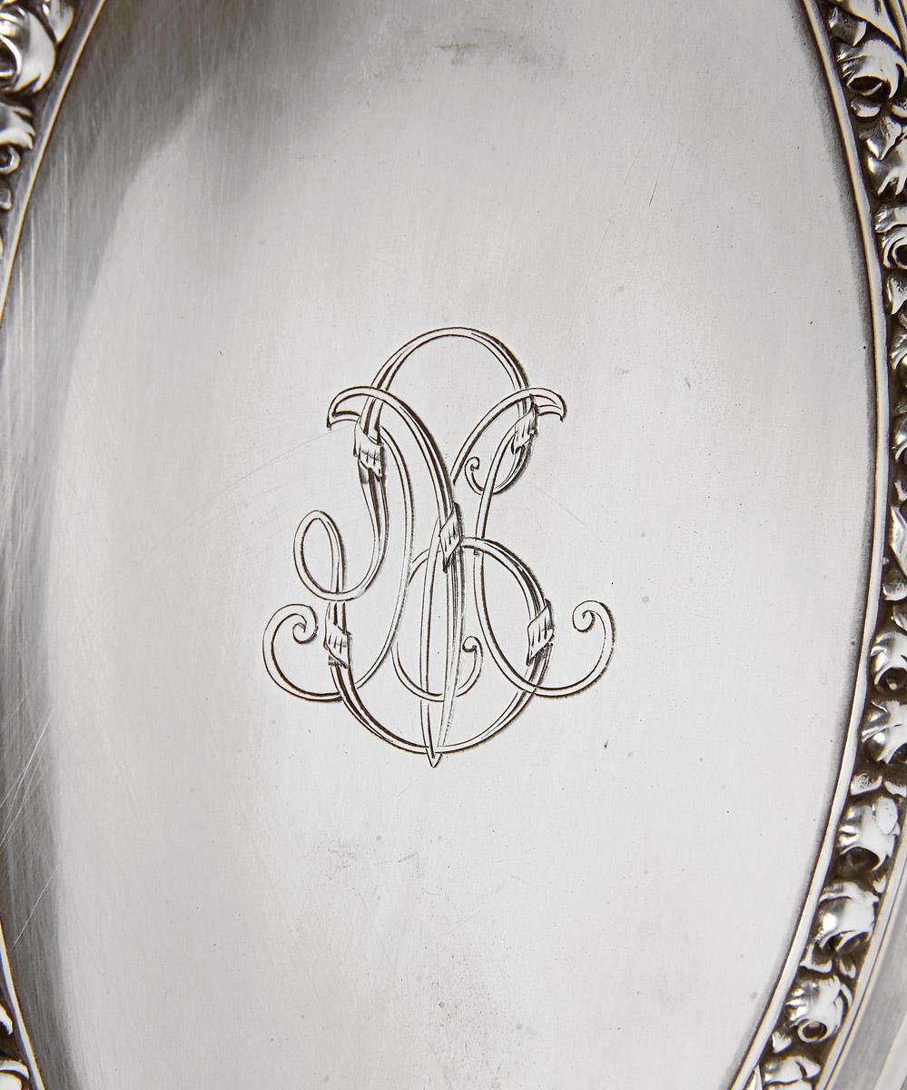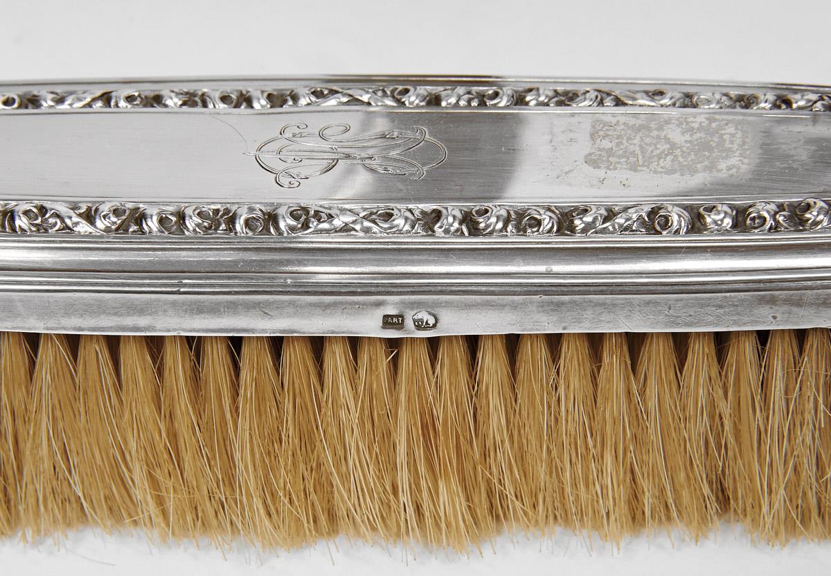 - aplicações em bronze prateado, interior com conjunto de toillete em prata monogramada e vidro trabalhado e gravado, composto por 4 frascos, caixa, 6 escovas, espelho de mão e 10 utensílios diversos dentro de gaveta, contraste Javali de Lisboa (1887-1937) e marca oficial aplicada em obras importadas por particulares