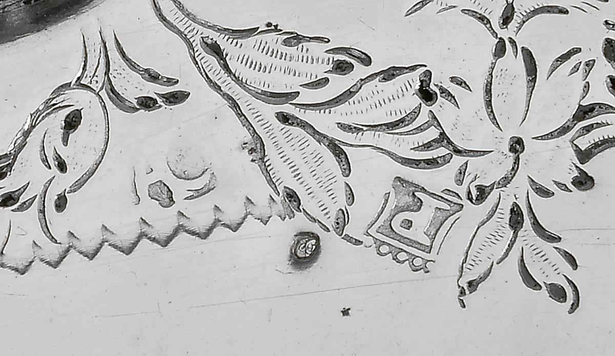 - bordo repuxado "Flores e concheados", fundo com decoração gravada "Grinaldas de flores", marca de ensaiador do Porto (1784-1792), marca de ourives AC (1784-1790)