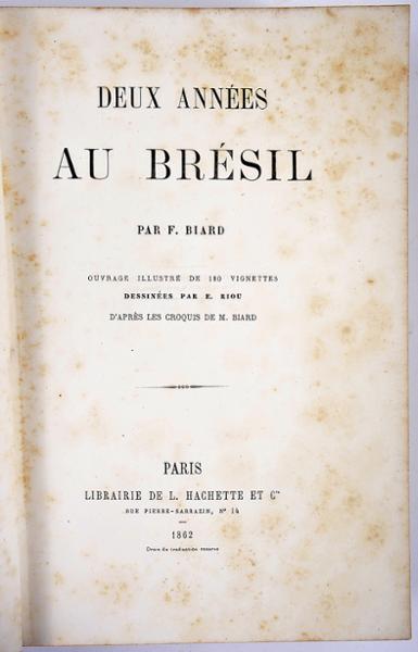 - BIARD, François-Auguste.- Deux années au Brésil.- Paris: Librairie de L. Hachette et Cie., 1862.- [4], 680 p.: il., 1 mapa desdobr.; 23 cm.- E. O autor (1798-1882), naturalista e pintor francês, natural de Lyon, permaneceu no Brasil cerca de dois anos (1858 e 1859), tendo pintado um retrato da família imperial. Durante a sua viagem coleccionou espécies de animais, insectos, répteis, etc. A obra é ilustrada com 180 gravuras xilográficas, no texto e em separado, executadas por Édouard Riou, segundo originais do autor. Inclui ainda um mapa desdobrável da Amazónia. Exemplar com leves manchas de acidez. Encadernação da época, com a lombada em marroquim negro, ligeiramente cansada. Sabi, 5134. Borba de Moraes, Brasiliana, p. 106.
