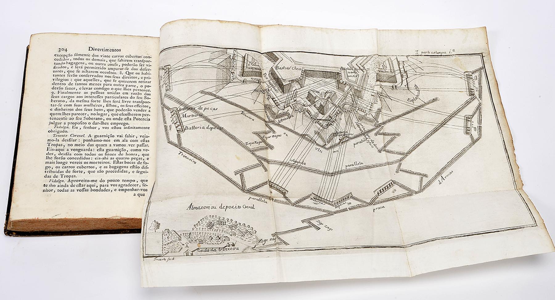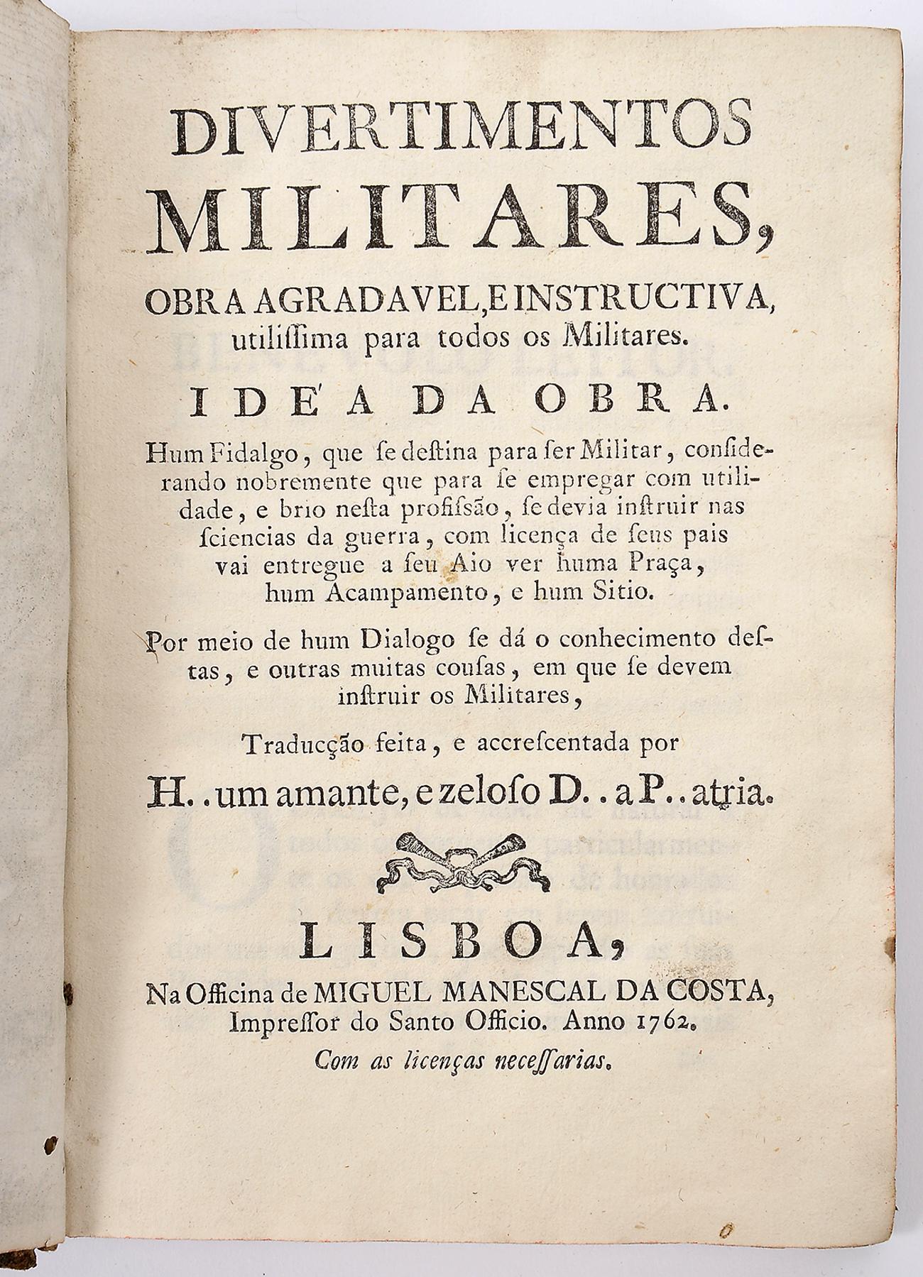 - obra agradavel, e instructiva, utilissima para todos os militares. Idea da obra. Hum fidaldo, que se destina para ser militar [...] / traducção feita, e accrescentada por H..um amante, e zeloso D..a P..atria.- Lisboa: Na Officina de Miguel Manescal da Costa, 1762.- [16], 305, [5] p.: il.; 20 cm.- E. A obra, de autor não identificado, traduzida por Henrique de Pradtt, pretende servir de manual a qualquer fidalgo que se preze e, «com licença de seus pais», deseje seguir uma carreira militar. Edição ilustrada com um frontispício gravado e 16 gravuras subscritas por Juzarte, sendo 10 duplas (duas por folha) e as restantes seis em folhas desdobráveis. A subscrição da última gravura é especialmente interessante: Joaquim António Juzarte Abrio E mora Na travessa Dos ladroins (Ernesto Soares, «História», 1219). Uma gravura desdobrável com rasgão junto ao festo, mas sem falta de suporte. Exemplar levemente manuseado, revestido de encadernação da época, inteira de carneira mosqueada. Inocêncio, III, p. 187. Gonçalves Rodrigues (Tradução), 1022.