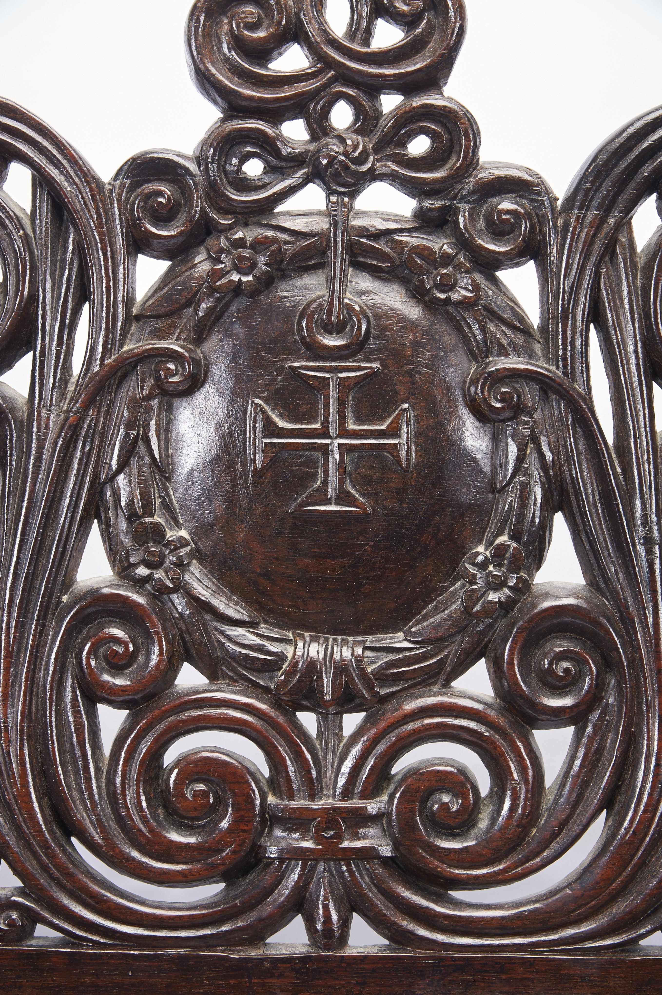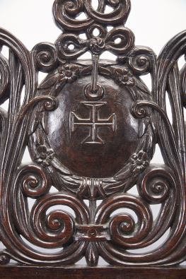 - colunas espiraladas, espaldar com entalhamentos e medalhão central com cruz da Ordem de Cristo, aros de bronze