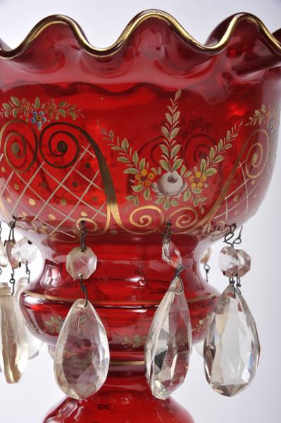 - decoração moldada, policromada e dourada "Flores", pingentes em cristal facetado, bases em metal relevado e vazado