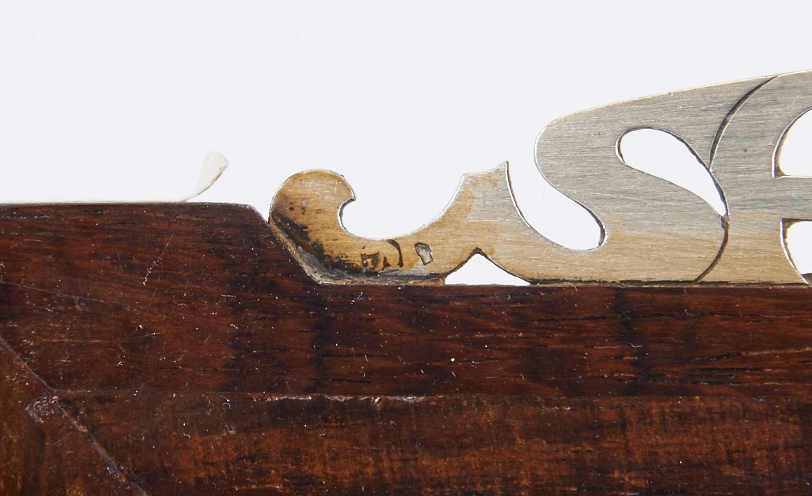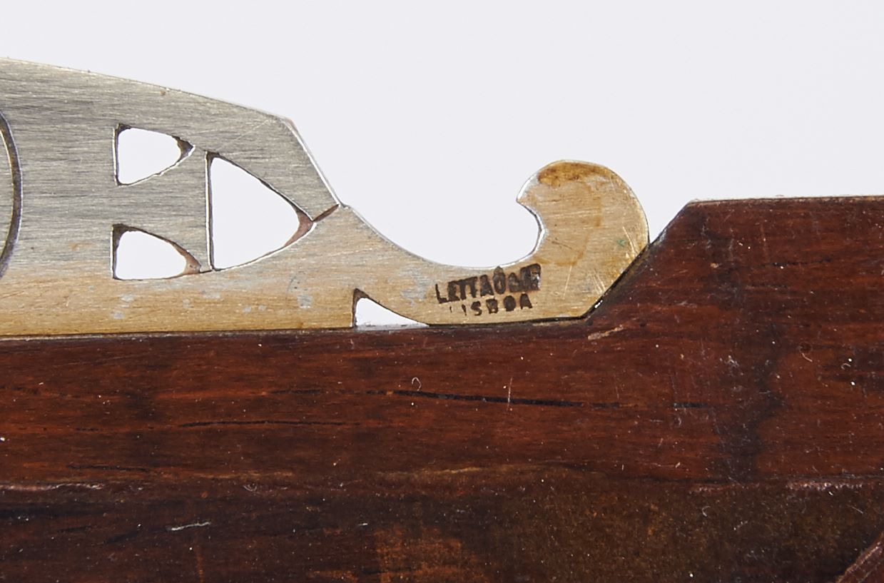 - moldura em pau-santo, cimalha em prata recortada com inscrição SAUDADE, contraste Javali de Lisboa (1887-1937), marca de ourives de LEITÃO & IRMÃO