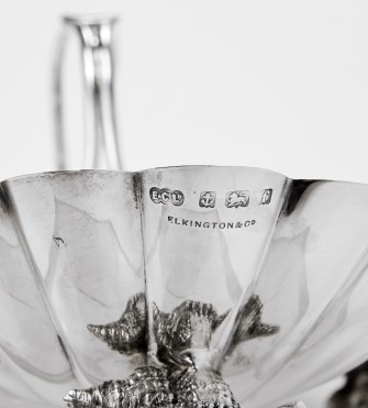 - decoração relevada "Conchas", pes em forma de "Búzios", marca da cidade de Birmingham (1905-1906), marcado ELKINGTON & Cº