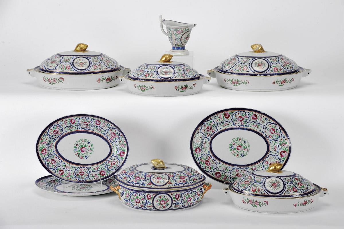 - composto por terrina com travessa, prato coberto oval, dois pares de rechaud ovais com tampa, quatro pratos cobertos rectangulares, cinco pares de travessas ovais, travessa oval, molheira, doze pratos de rechaud, doze pratos de sopa, doze pratos rasos, de