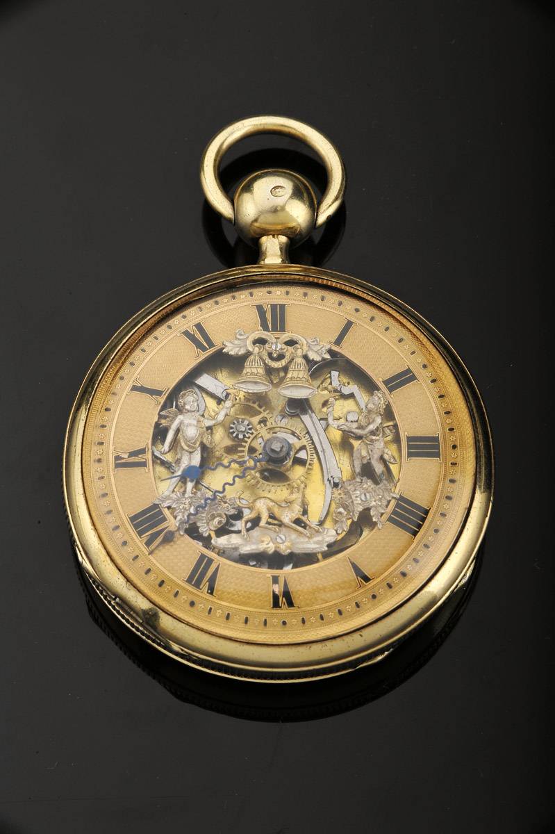 - mostrador em latão guilhochado, decoração em prata relevada "Cão, puttis e sino", movimento mecânico de repetição de quartos de hora, com chave