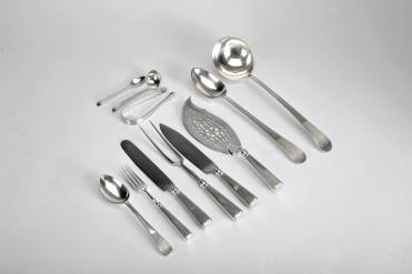- interior contendo divisórias forrado a veludo bordeaux e galão dourado com faqueiro para doze pessoas em prata, composto por 8 talheres de servir, colheres de sopa, talher de resto e colher de chá, marcas de ensaidor de Guimarães, marca de ourives IIM
