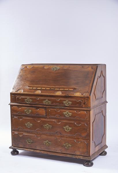 - frente das gavetas e laterais com «painéis», interior recortado com gavetas, escaninhos e porta central ladeada por duplas colunas espiraladas, segredos, ferragens em bronze