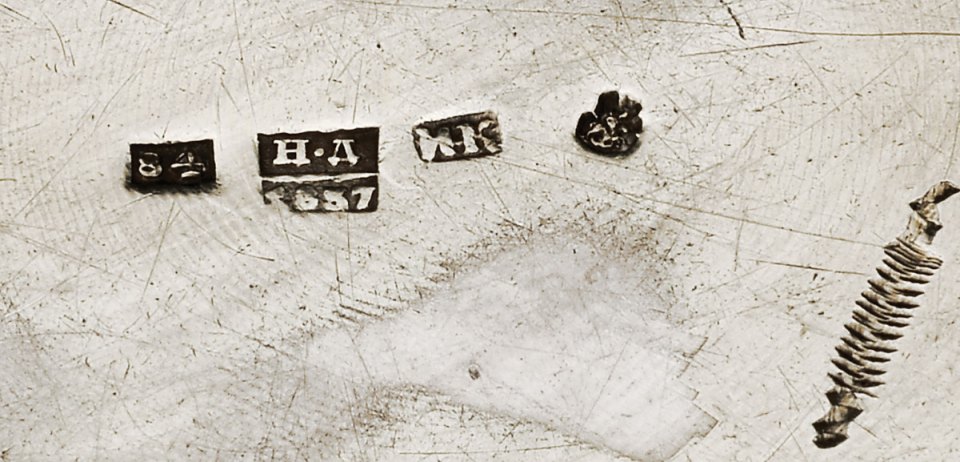 - decoração guilhochada e gravada a niello "Palácio de Inverno" e "Arco do Triunfo", marca de teor de 84 zlotnicks, marca de ensaiador de Moscovo de Nicholai Bubrovin (1822-1855), marca de ourives de Ivan Kaltikov (1820-1834)