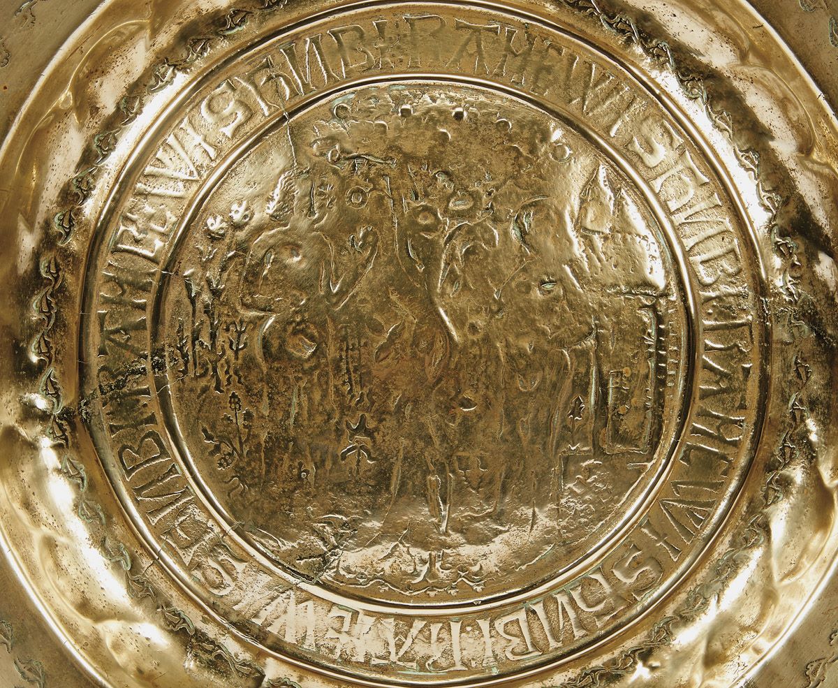 - decoração relevada e gravada "Adão e Eva", tarja com inscrição em letras góticas