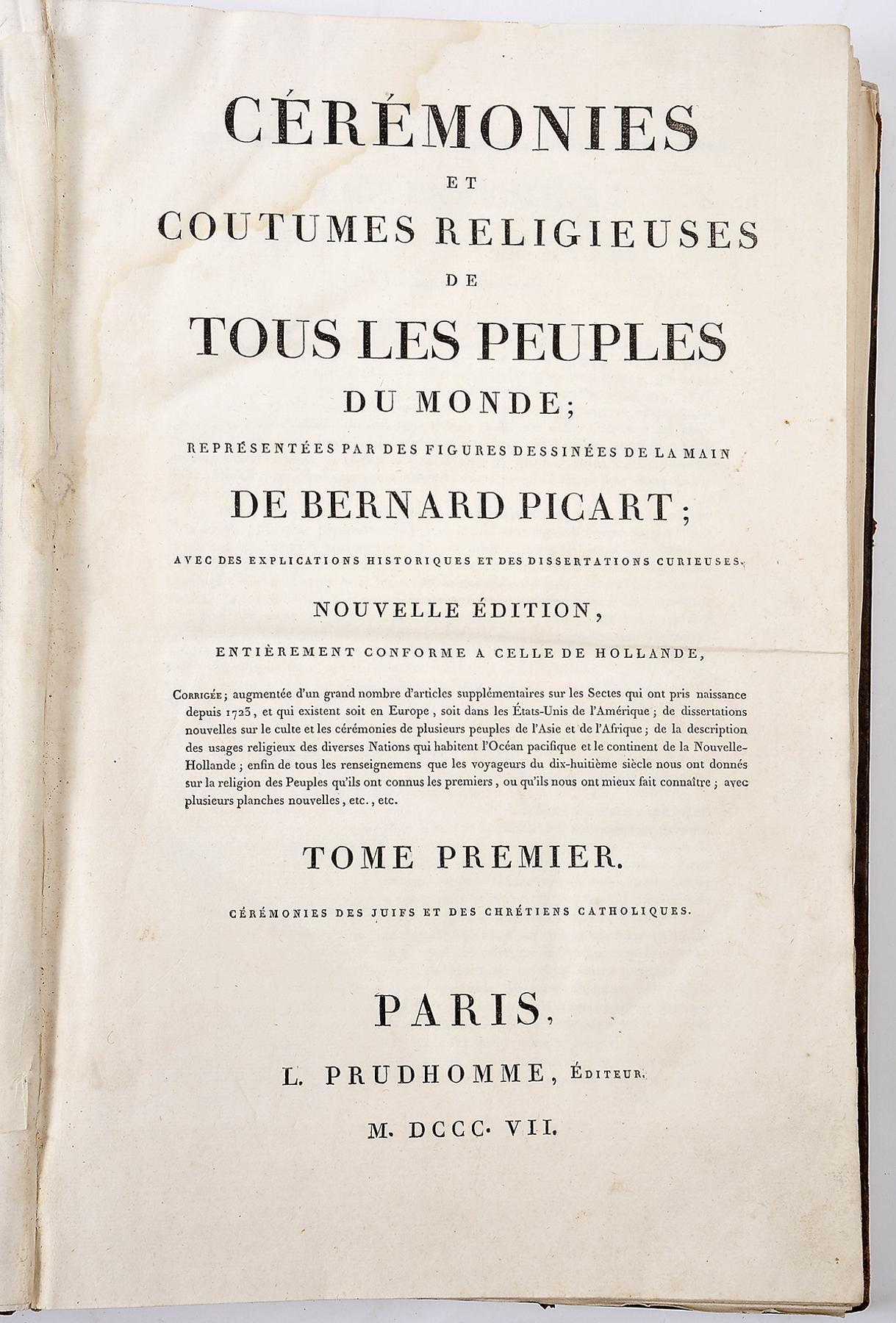 - PICART, Bernard (il.).- Cérémonies et coutumes religieuses de tous les peuples du monde; réprésentées par des figures dessinés de la main de Bernard Picart; avec des explications historiques et des dissertations curieuses.- Nouvelle édition, entièrement conforme a celle de Hollande...- Paris: L. Prudhomme, 1807.- 5 tomos em 6 vols. (tomos 1, 2, 6, 7 [2 vols.] e 12): il.; 40 cm.- E.