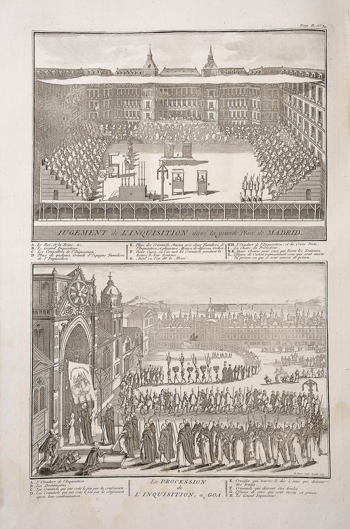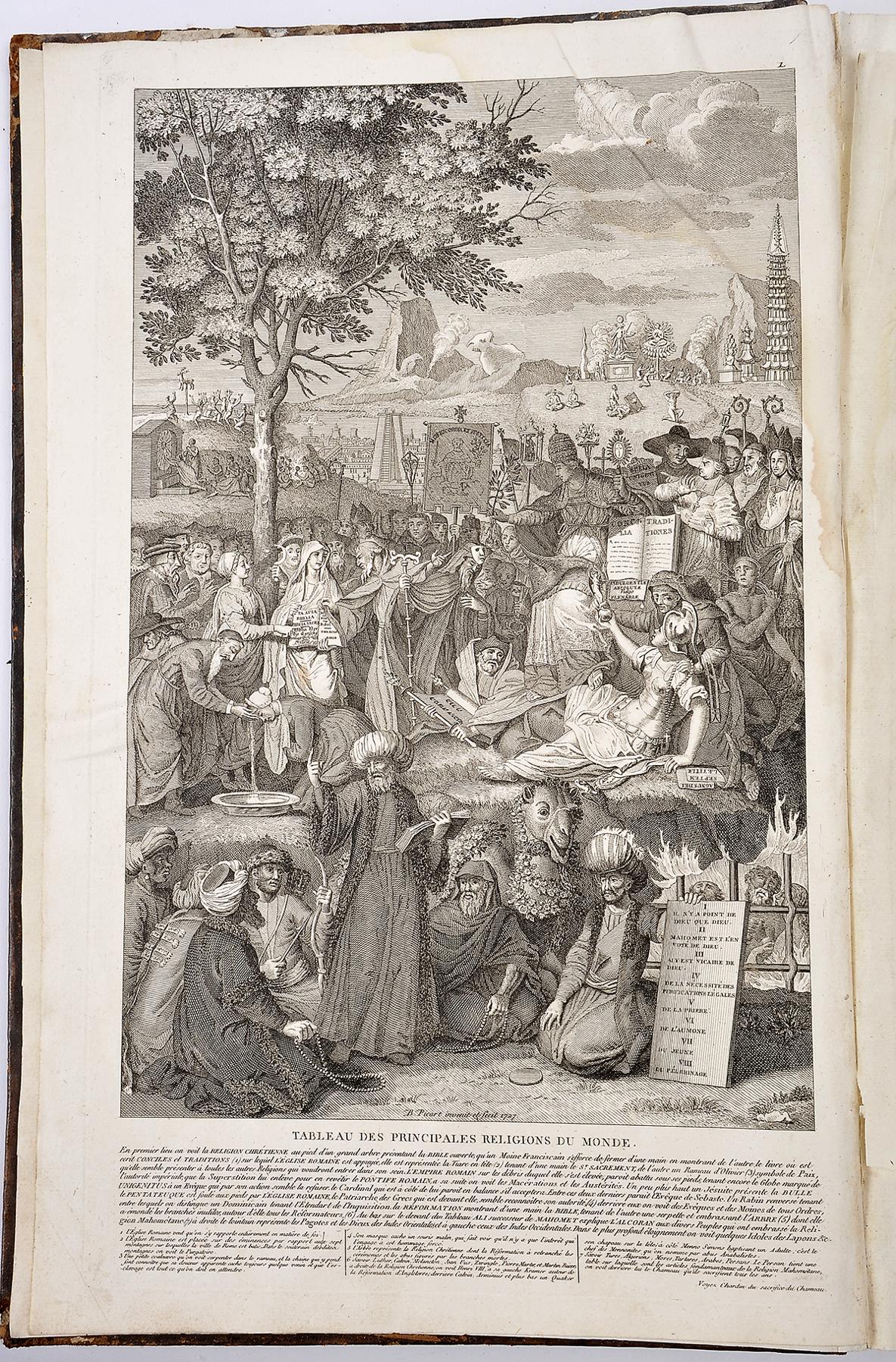 Exemplar de trabalho, com numerosas faltas e imperfeições, constituído pelos tomos I (Juifs et Chrétiens Catholiques), II (Catholiques Romains), VI (Peuples Idolâtres), VII ([première partie] Peuples Idolâtres), VII ([deuxième partie] Peuples Idolâtres) e XII (second des Superstitions). O conjunto apresenta numerosas faltas e imperfeições de difícil discriminação, sendo as seguintes as mais graves e aparentes. Tomo I (desconjuntado): inclui 27 gravuras de plena página (frontispício + 26 grav., de acordo com o índice), faltando-lhe as gravuras 4, 17, 21, 22 e 28 (todas duplas), corte de traça profundo afectando as últimas 12 folhas e 3 grav.), leve mancha de água (de maré) no terço superior, junto ao festo; tomo II: conserva todas as 33 gravuras (5 duplas), mas as 5 primeiras danificadas por manchas de água e cortes de traça as últimas 20 folhas e 2 gravuras (restantes gravuras limpas, incluindo 3 duplas); tomo VI (sem manchas nem cortes: faltam 7 gravuras das 27 que deveria conter (3, 5, 6, 13, 19, 23 e 26); tomo VII (1ª parte): completo com as 44 gravuras, mas cerca de metade do volume e das gravuras danificadas por fortes manchas de fungos e cortes de traça; tomo VII (2ª parte): completo com as 33 gravuras limpas e sem cortes; tomo XII: completo com as 2 gravuras, corte de traça na margem inferior da primeira metade e forte mancha de água e fungos na segunda metade. Boas encadernações da época, inteiras de carneira racinée, com lombadas lisas.