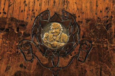 - costas com decoração gravada e medalhão em bronze "Símbolo do café «A Brasileira»", assento em couro