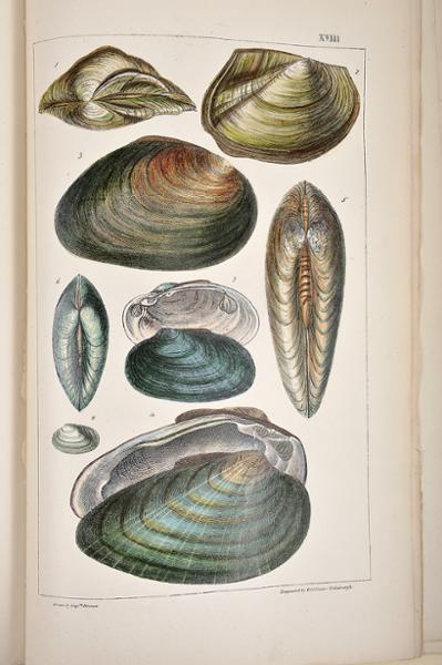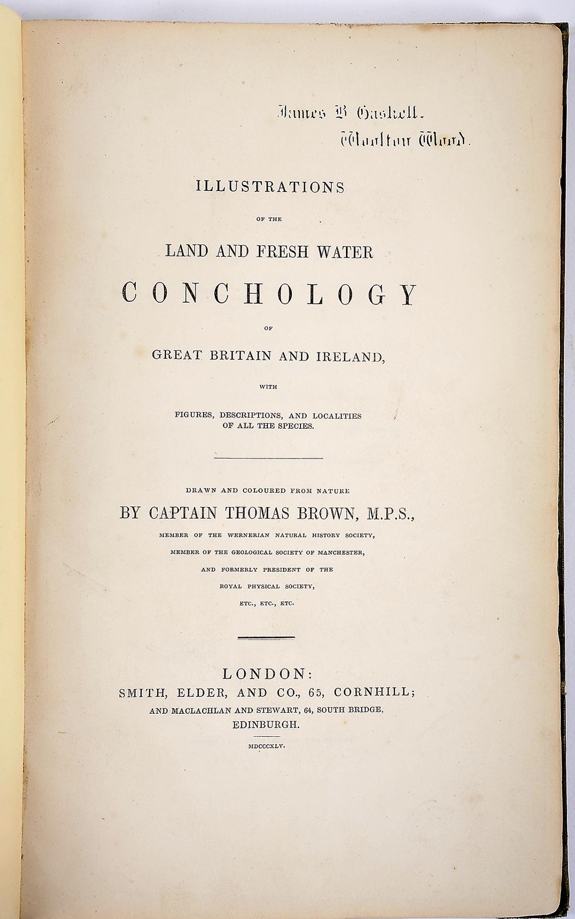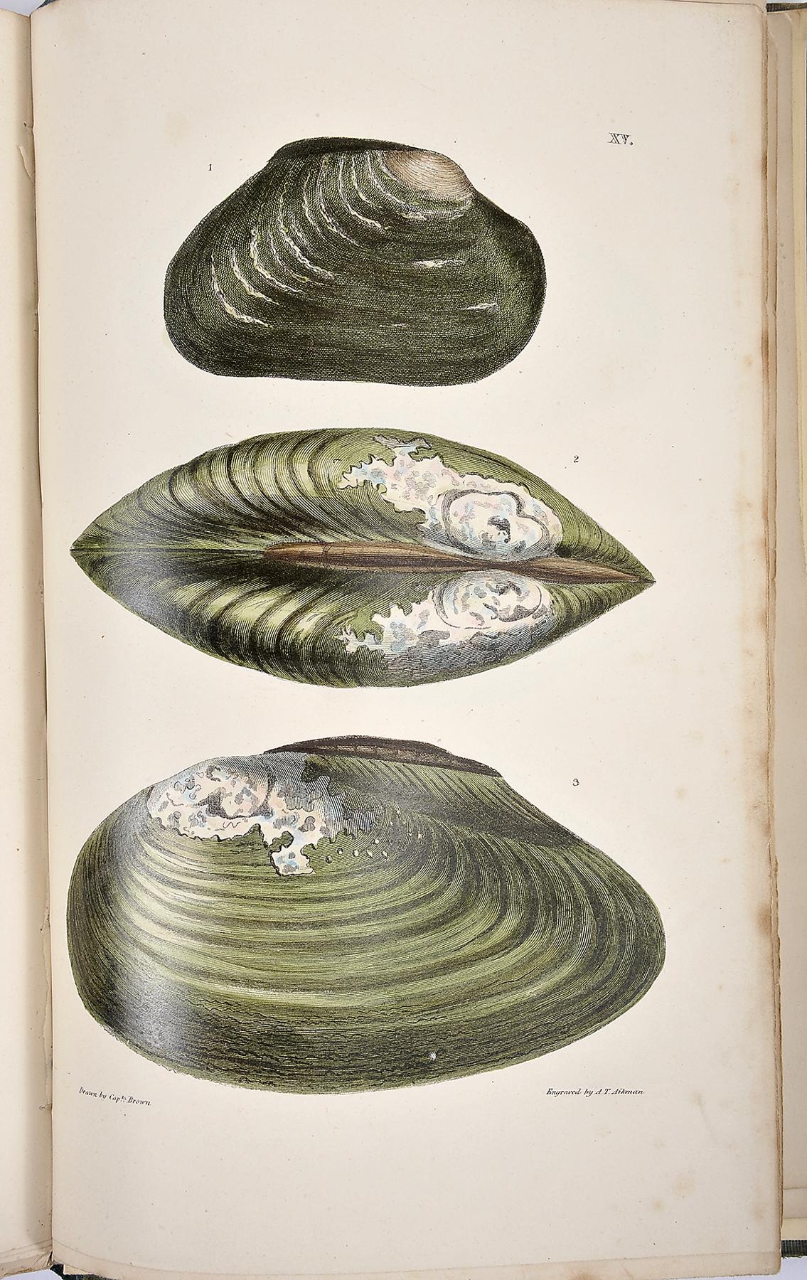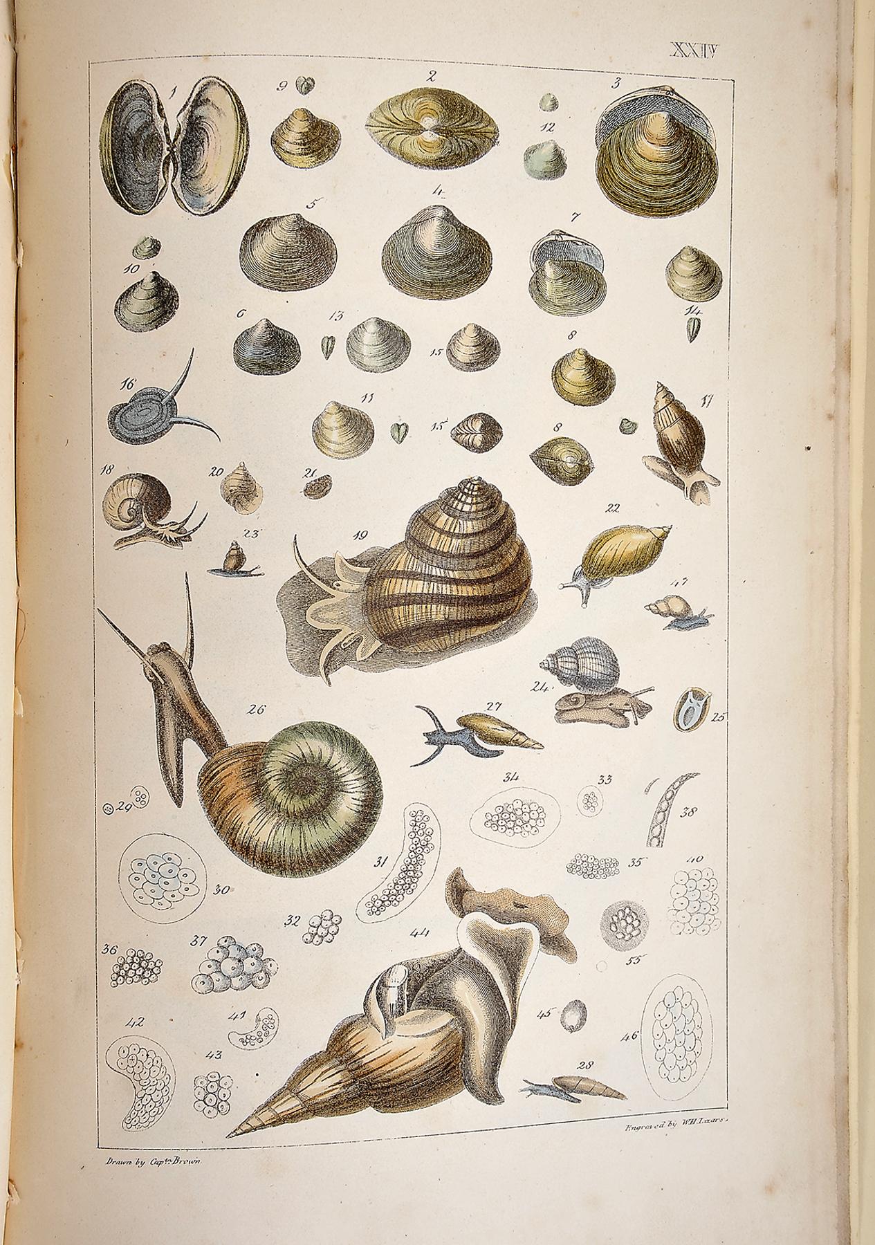 - BROWN, Cap. Thomas.- Illustrations of land and fresh water conchology of Great Britain and Ireland...- London: Smith, Elder, and Co., 1845.- IX, [1 br.], 144 p.: XXVII gravuras color.; 26 cm.- E. Thomas Brown(1785-1862), naturalista e malacologista escocês, natural de Perth, foi director do Museu de Manchester, foi autor de extensa obra no domínio das ciências naturais que ele próprio ilustrava e, por vezes, coloria. Estampa I com rasgão (sem falta de suporte) reparado no verso com fita adesiva. Página de rosto com pequena chancela. Encadernação do editor, em tela verde, com a lombada refeita.