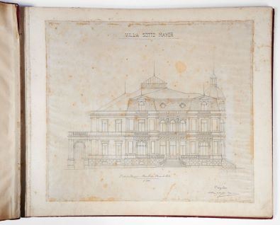 Desenhos com algumas manchas de acidez, revestidos da encadernação original, em percalina vermelha, com a lombada em marroquim (um pouco cansada), apresentando no plano superior a gravação a ouro: Villa Sotto Mayor - Projecto de A. R. Nogueira. Lisboa - 1902.