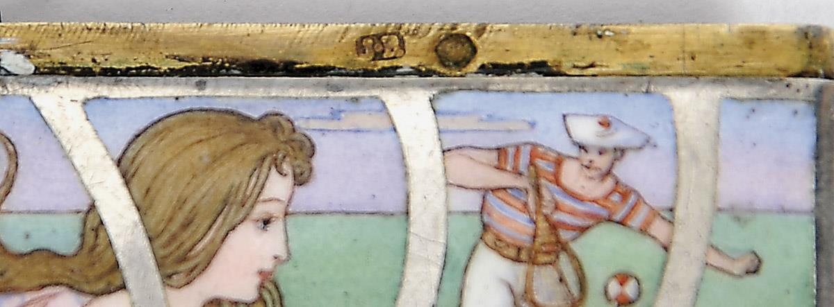 - decoração esmaltada e policromada "Figuras jogando ténis", marca de garantia de Viena (1867-1922), marca de ourives JR