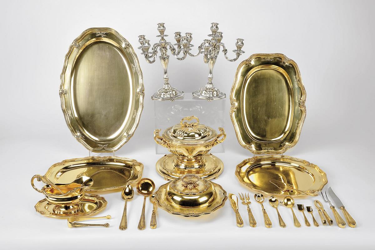 - decoração relevada segundo modelo de Thomas Germain, composta por terrina redonda com plateau, três travessas e prato de servir, grelha, molheira com travessa, prato coberto redondo, 24 pratos marcadores, 12 pratos de sobremesa, 12 pratos de pão, 12 lavab