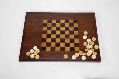 - embutidos em espinheiro e pau-santo, trinta pedras de gamão em marfim parcialmente tingido de vermelho