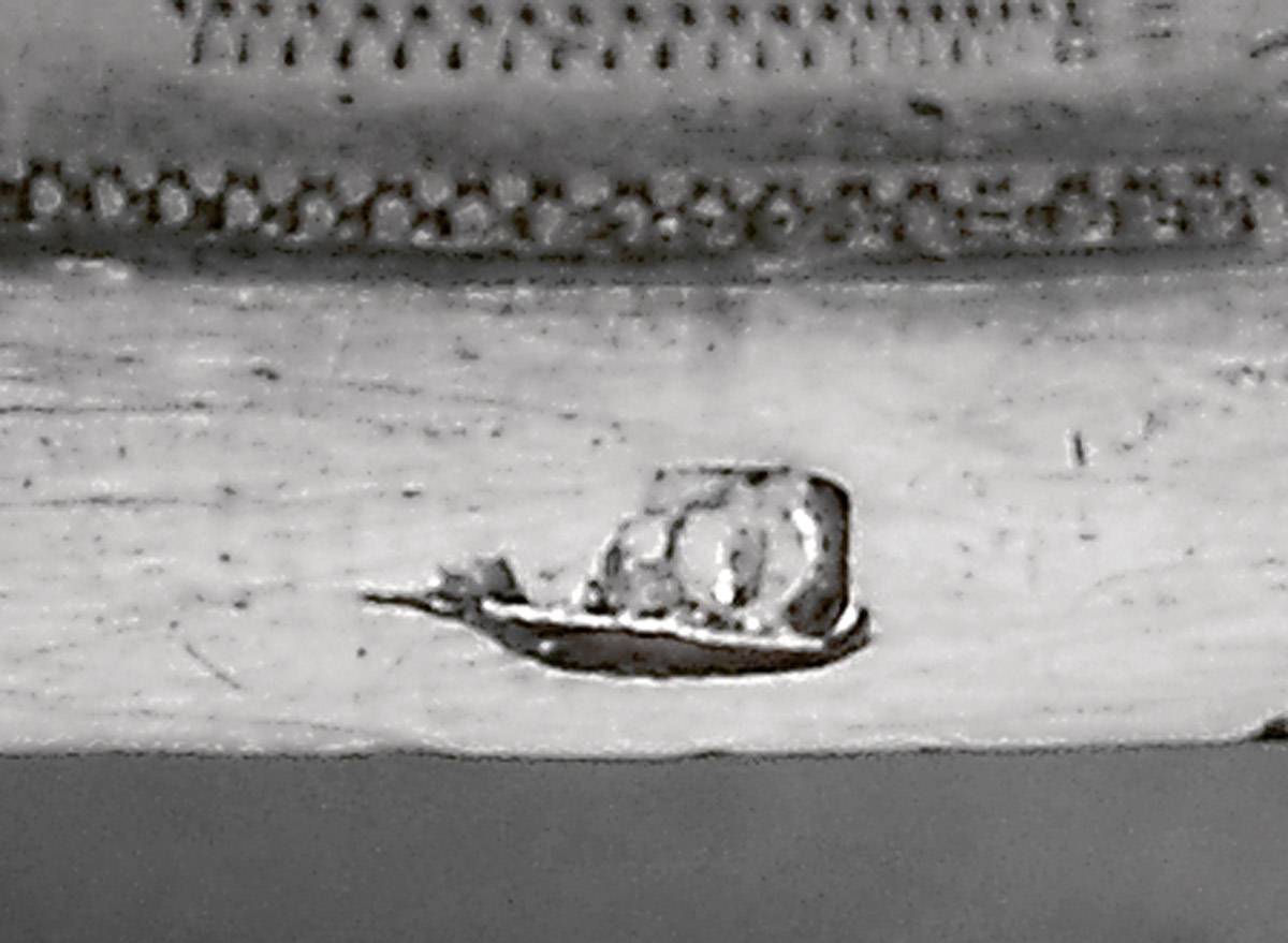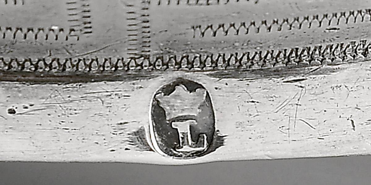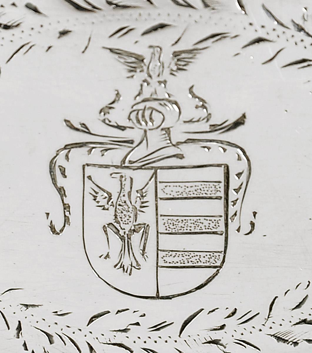 - decoração gravada com armas partidas: 1º - Azevedo; 2º Ferreira; elmo e timbre de Azevedo, marca de ensaiador de Lisboa (1810-1822), marca de ourives de Quirino António Pereira (1816-1870)