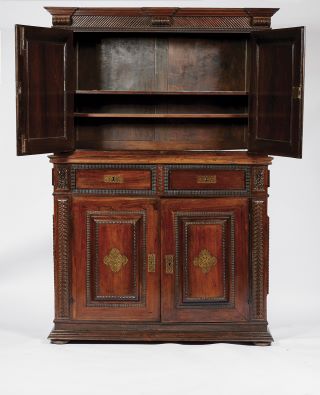 - portas almofadadas com frisos torcidos e termidos, ferragens em metal amarelo recortado e vazado