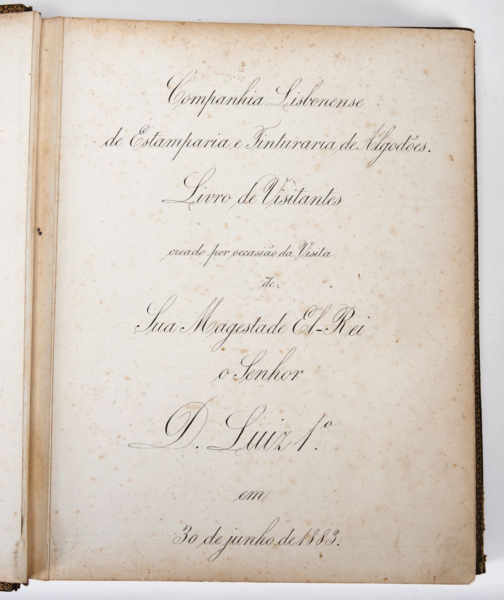 - Volume constituído por 26 folhas de cartolina, das quais apenas 6 foram preenchidas, de ambos os lados. Encadernação original, inteira de marroquim negro, com a etiqueta de Augusto Férin, livreiro encadernador. No plano superior apresenta a seguinte inscrição gravada a ouro, enquadrada em elaborada moldura de ferros dourados: Companhia Lisbonense de Estamparia e Tinturaria de Algodões - Livro de Visitantes - creado por occasião da visita de Sua Magestade El-Rei o Senhor D. Luiz Iº. em 30 de Junho de 1883. Este título repete-se, caligrafado, na folha de rosto. Na folha seguinte encontra-se a mensagem autógrafa, assinada, de D. Luiz I (5 linhas); no verso, as assinaturas dos dignatários que acompanhavam o soberano: Hintze Ribeiro, conde de Ficalho, gen. Sousa Folque e conde de Arnoso. Nas folhas seguintes, diversas mensagens de visitantes, a última das quais data de 17 de Maio de 1917. De salientar a mensagem datada de 16 de Abril de 1890, de Sebastião de Magalhães Lima e a de 6 de Fevereiro de 1911, que contem uma elogiosa referência ao então director-técnico da fábrica, José Cambournac.