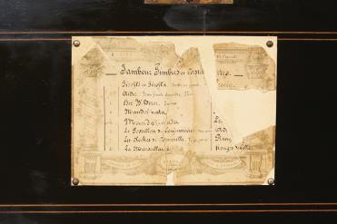 - folheado de pau-santo e madeira ebanizada com filetes de espinheiro e embutidos "Flores"