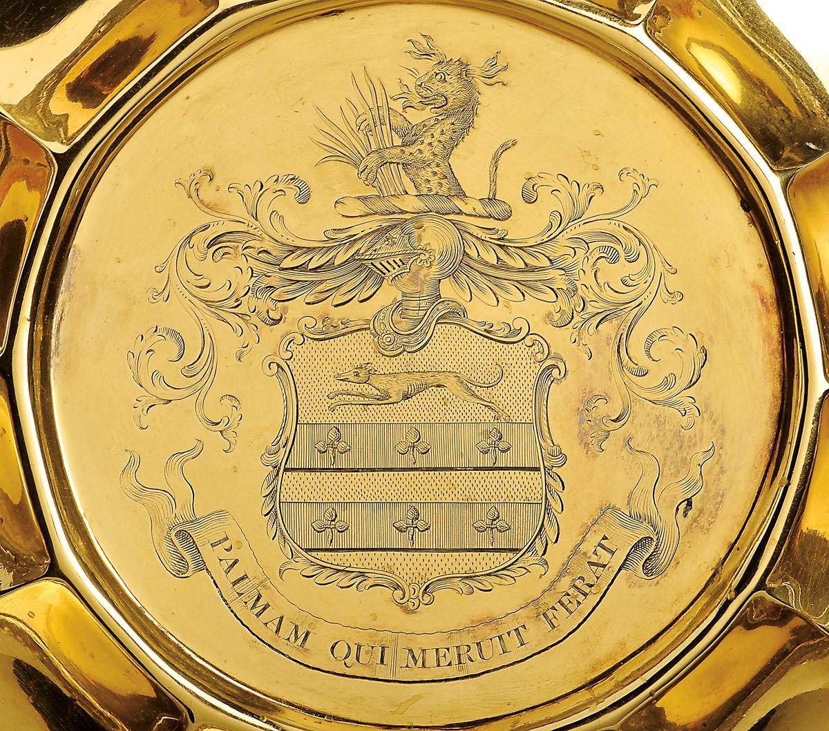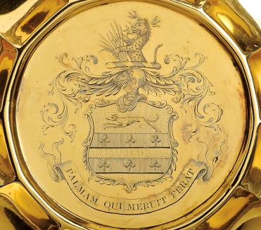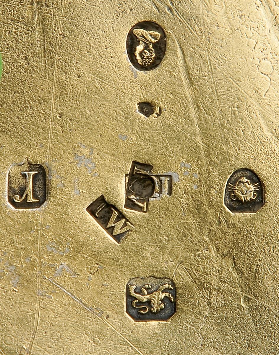 - decoração relevada e gravada"Puttis" e "Armas de família inglesa", marca da cidade de Londres (1832-1833), marca de ourives John Wakefield (1806-?)
