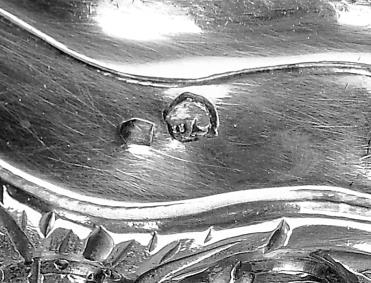 - decoração com bordo relevado e fundo gravado, contraste Javali de Lisboa (1887-1937), marca de ourives de Manuel do Carmo Almeida (1924)