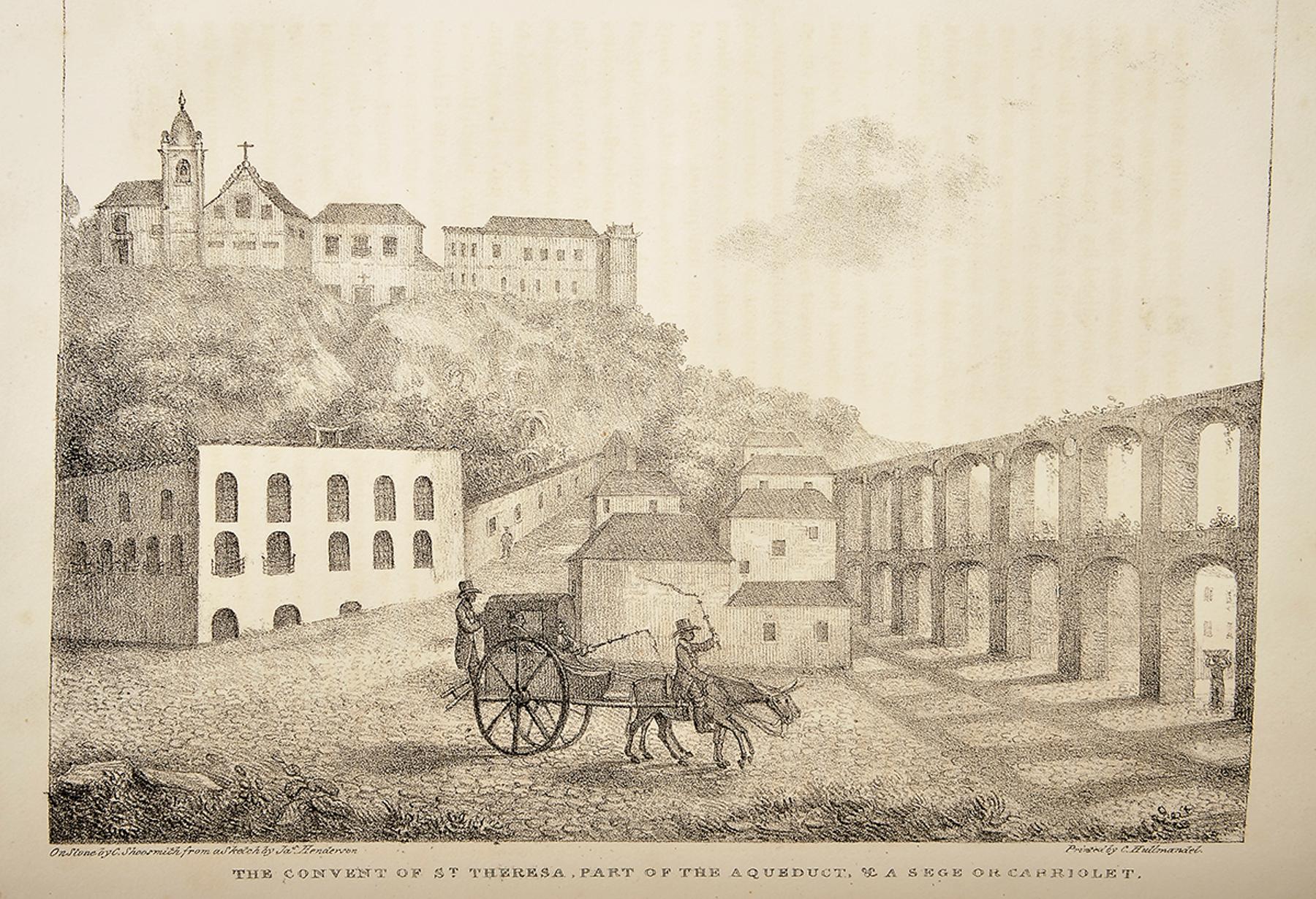 - HENDERSON, James.- A history of the Brazil; comprising its geography, commerce, colonization, aboriginal inhabitants, &c. &c. &c.- London: published by Longman, Hurst, Rees, Orme, and Brown, 1821.- XXIII, 522, [1] p.: il.; 27 cm.- E. A obra de Henderson é uma adaptação da Corografia de Ayres do Casal e é ilustrada com 28 litografias e dois mapas, segundo desenhos do autor, «d'après nature». Inclui ainda uma extensa «list of subscribers» (p. XV a XXIII). Exemplar com falta da folha de rosto, da folha preliminar [a4, (“Notice to the reader”, p. VII com verso em branco)] e da primeira estampa “D. John VI and his attendants” que devia figurar junto ao rosto. Integra, contudo, as restantes 29 estampas, 27 litografias e 2 mapas), segundo desenhos do autor, «d'après nature», incluindo a rara litografia com o nº 23 no índice, “A Brazilian sesta, or afternoon nap”. Exemplar por aparar, com ligeira acidez; mapa desdobrável do Brasil com restauro grosseiro no verso. Ex-libris na contra-capa: Metropolitan Borough of Islington, Public Libraries; carimbo CANCELLED na página [III]. Encadernação modesta (da época?), com a lombada em tela, danificada. Meia-encadernação de pele, da época. Embora incompleto, o exemplar integra um notável conjunto iconográfico brasileiro, do final do período colonial. Sabin, 31314. Borba de Moraes, p. 397. Bosch, 328. Rodrigues, 1210.