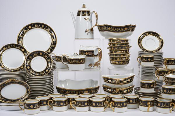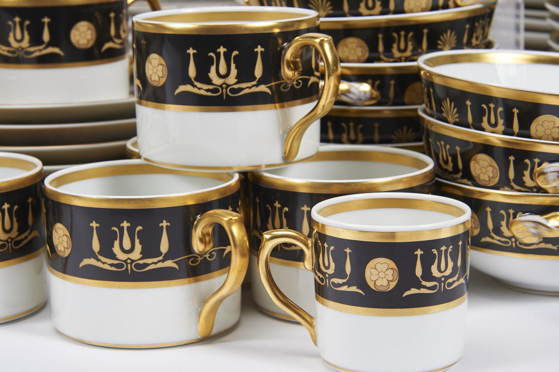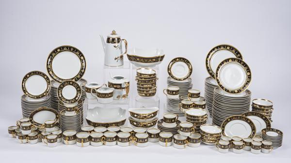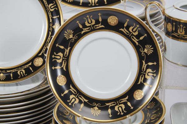 - decoração a negro e ouro "Liras", composto por quarenta e oito pratos rasos, vinte e quatro pratos de fruta, pratos de doce, taças de consomé com respectivos pratos, duas saladeiras, duas molheiras com travessa, quatro conserveiras, bule, leiteira, cafeteira, açucareiro, chávenas de chá e de café