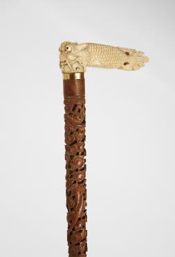 - decoração esculpida "Animais fantásticos e nuvens", cabo em marfim esculpido "Peixe", aro em metal dourado