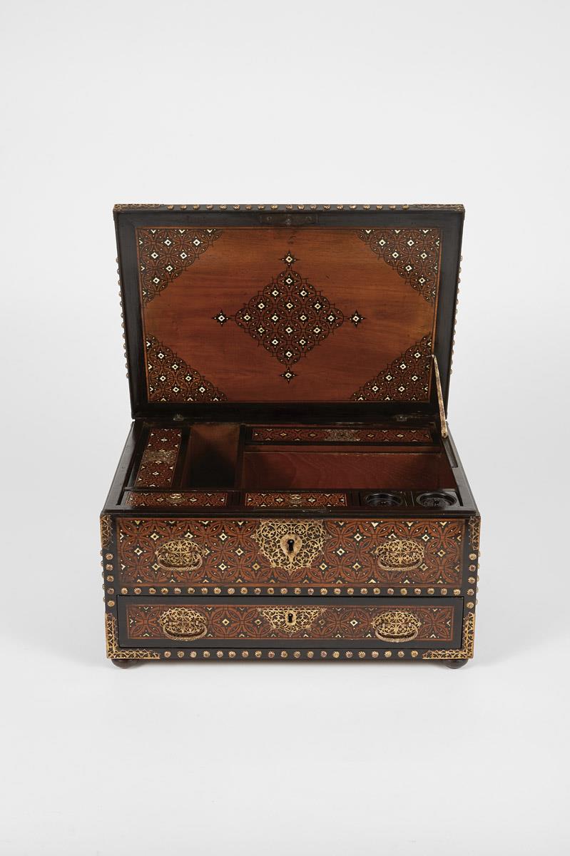 - revestimento parcial a ébano, embutidos de ébano e marfim "Círculos secantes", suporte da tampa, ferragens vazadas e tachas espiraladas em cobre dourado, interior com quatro receptáculos com tampas de decoração idêntica à do exterior, tinteiro e areeiro de ébano