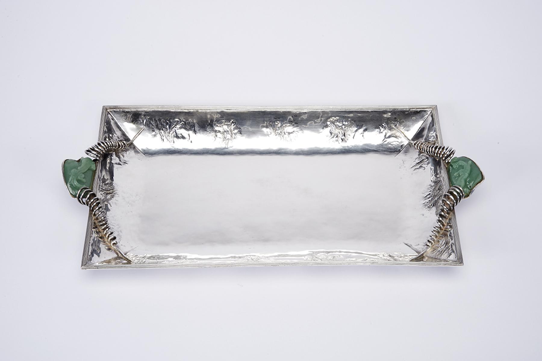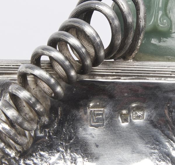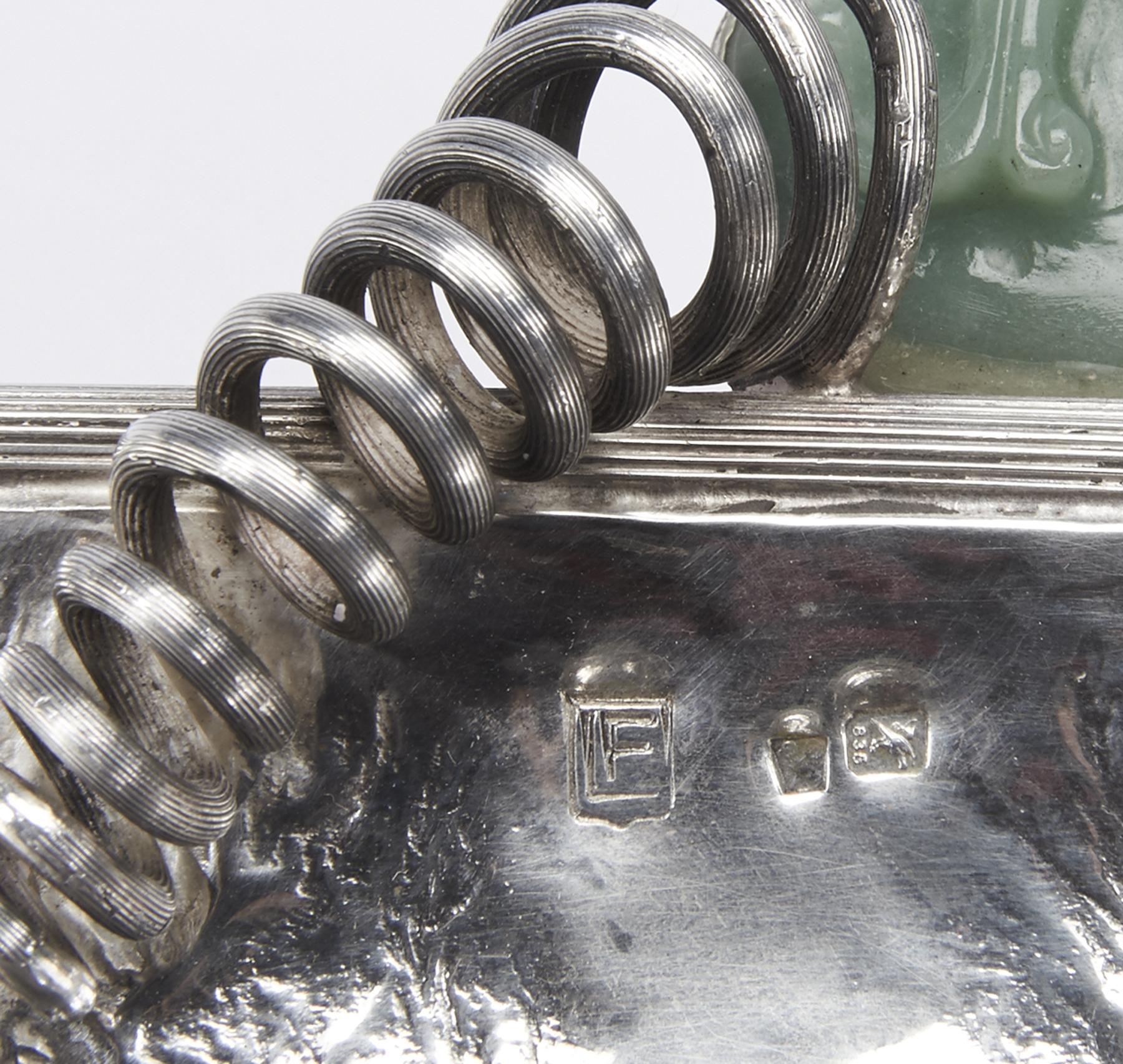 - orla com decoração revenida, pegas em fio espiralado e placas de jade esculpido "Animais estilizados"