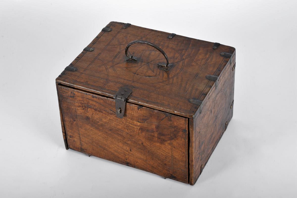 - decoração gravada "Desenhos geométricos", interior com aplicações em latão contendo seis gavetas simulando nove com frentes em latão vazado, ferragens em ferro