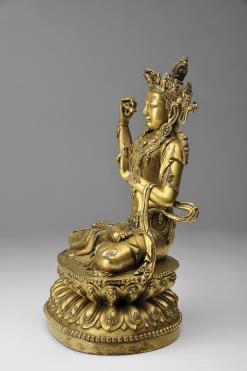 O "Bodhisattva" enverga o "dhoti" e um xaile celestial sobre os ombros, brincos redondos de grandes dimensões, o peito adornado com colares de jóias, os braços e os pulsos com braceletes e pulseiras. Um diadema envolvendo um penteado alto encima a face, que mostra compaixão e serenidade.